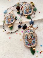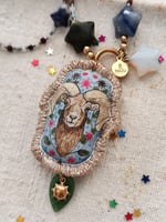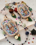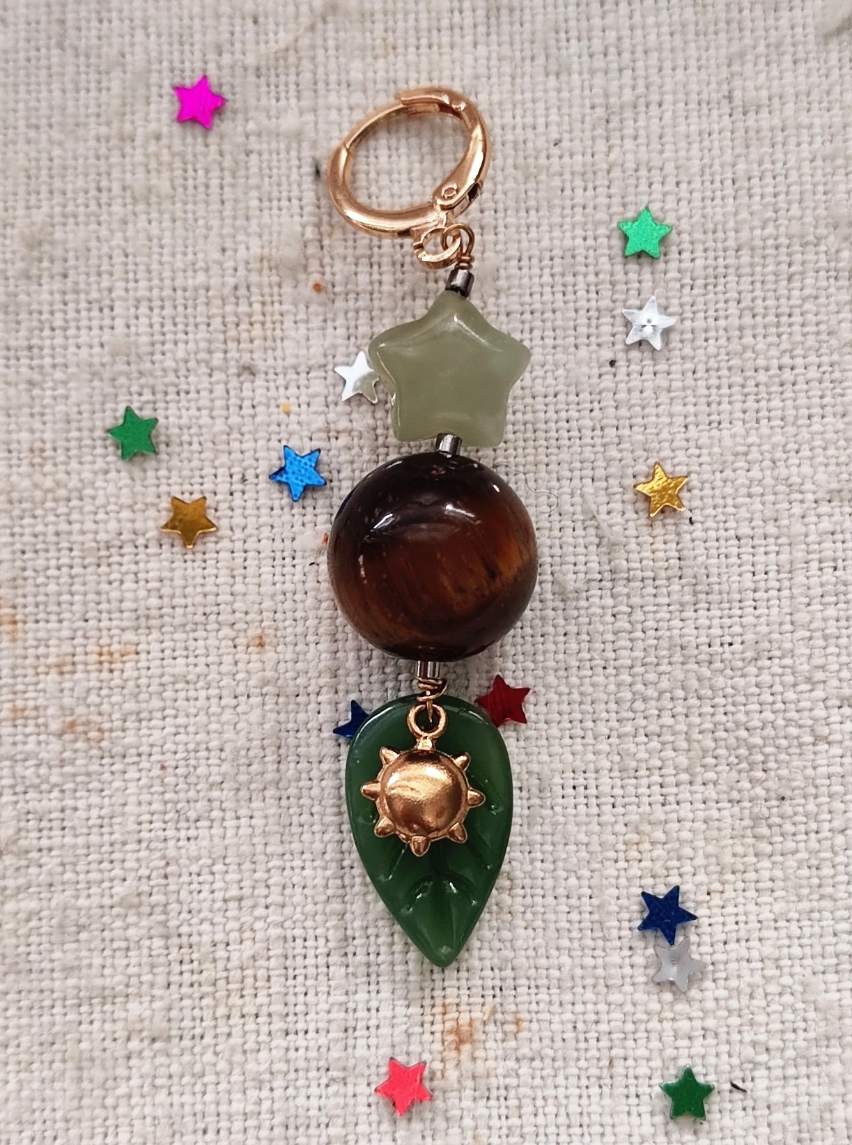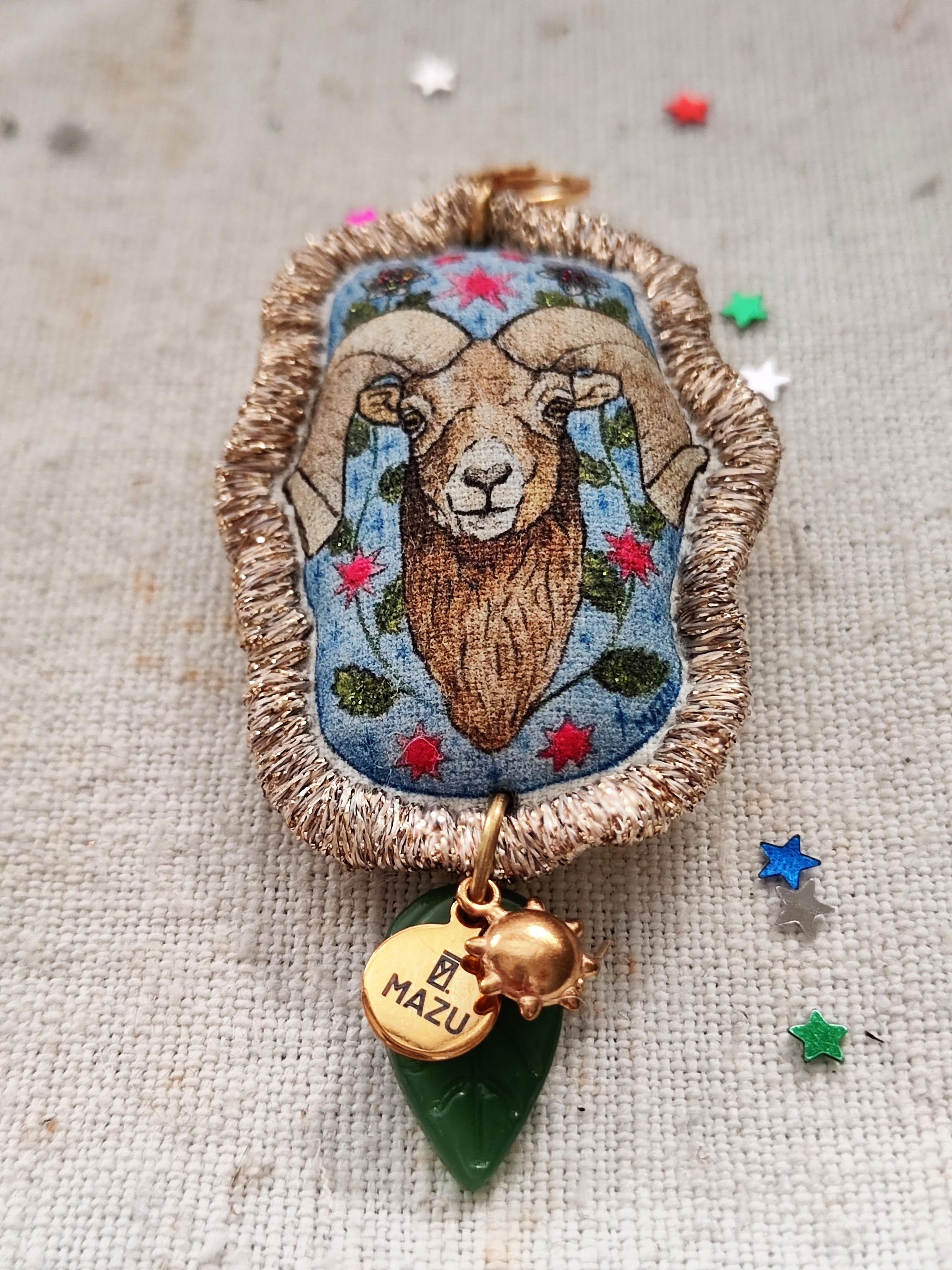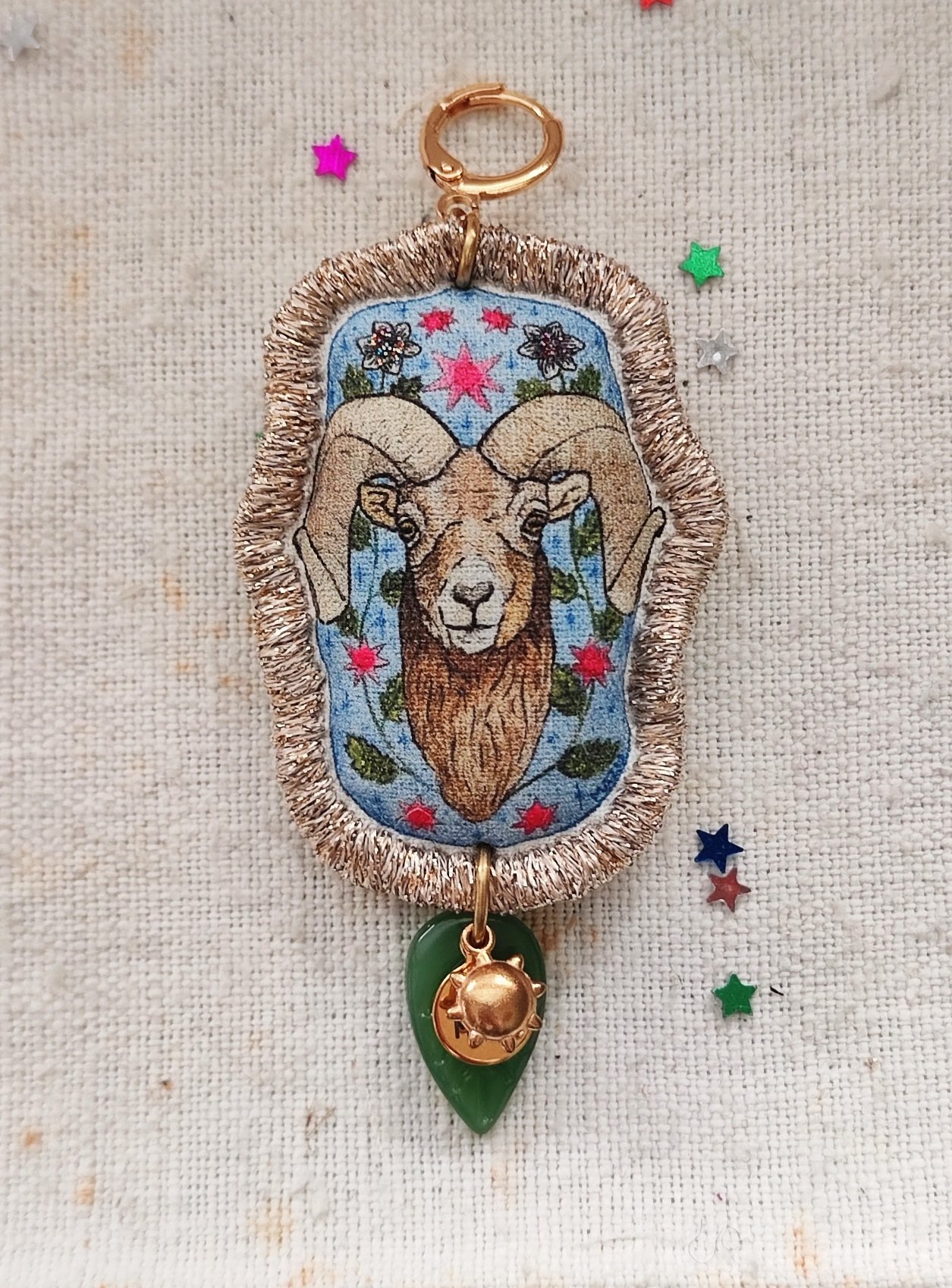 Alla fine, arriviamo al pendente! Come sempre, è un mio disegno, trasferito su tela in cotone vintage successivamente ritoccato con i colori scintillanti per il tessuto ✨. Al pendente ho aggiunto una foglia in vetro verde e un piccolo sole in acciaio dorato.