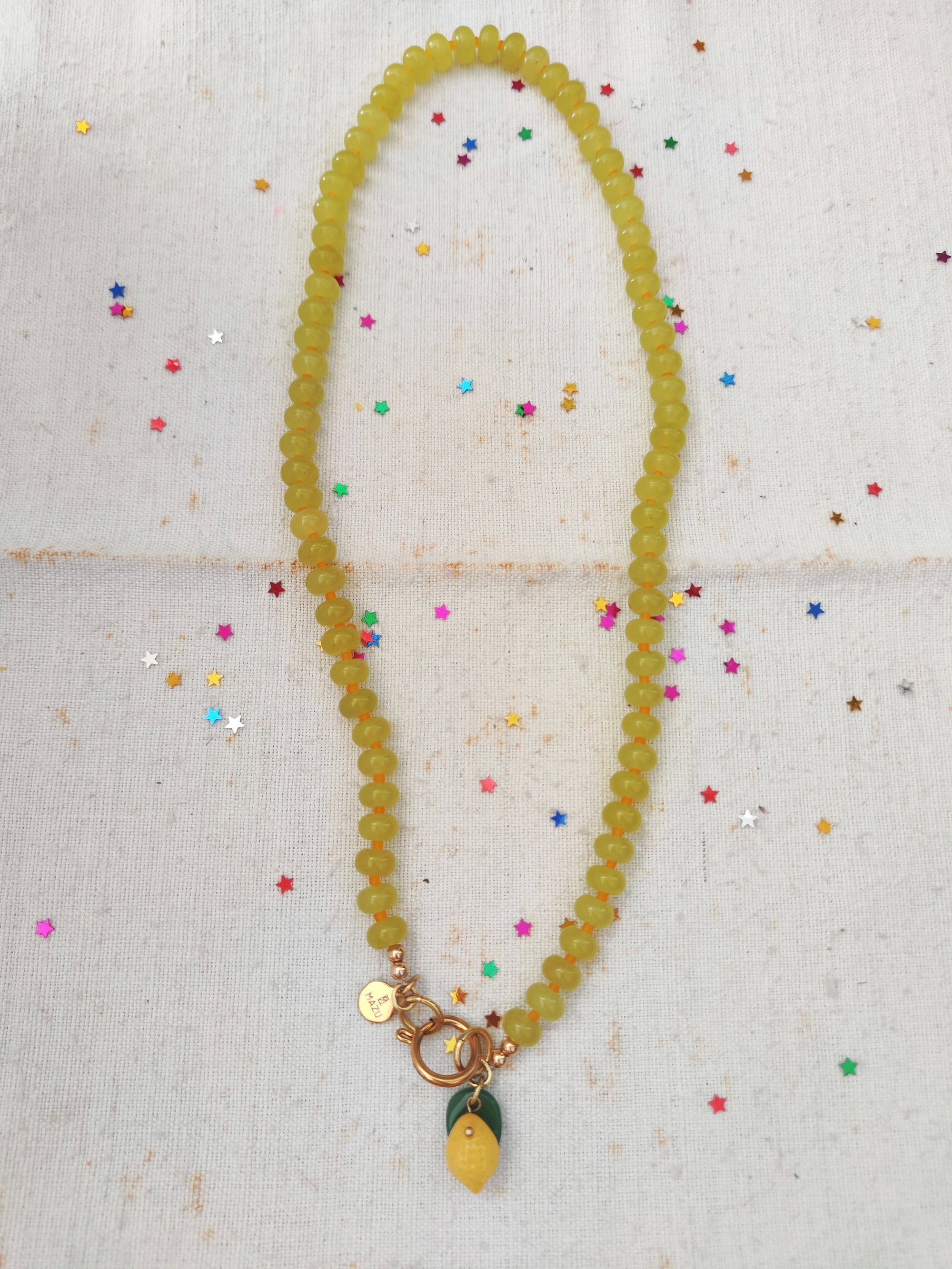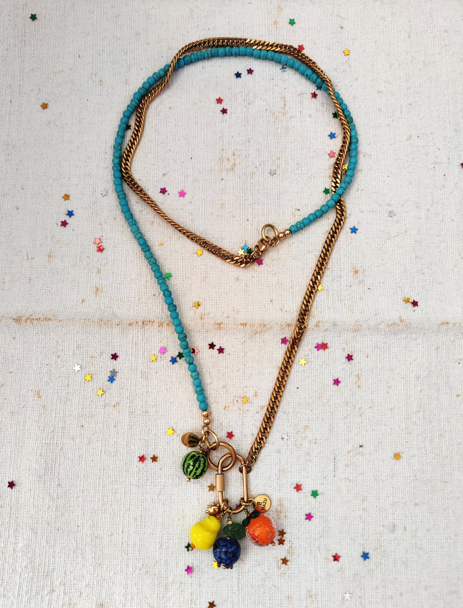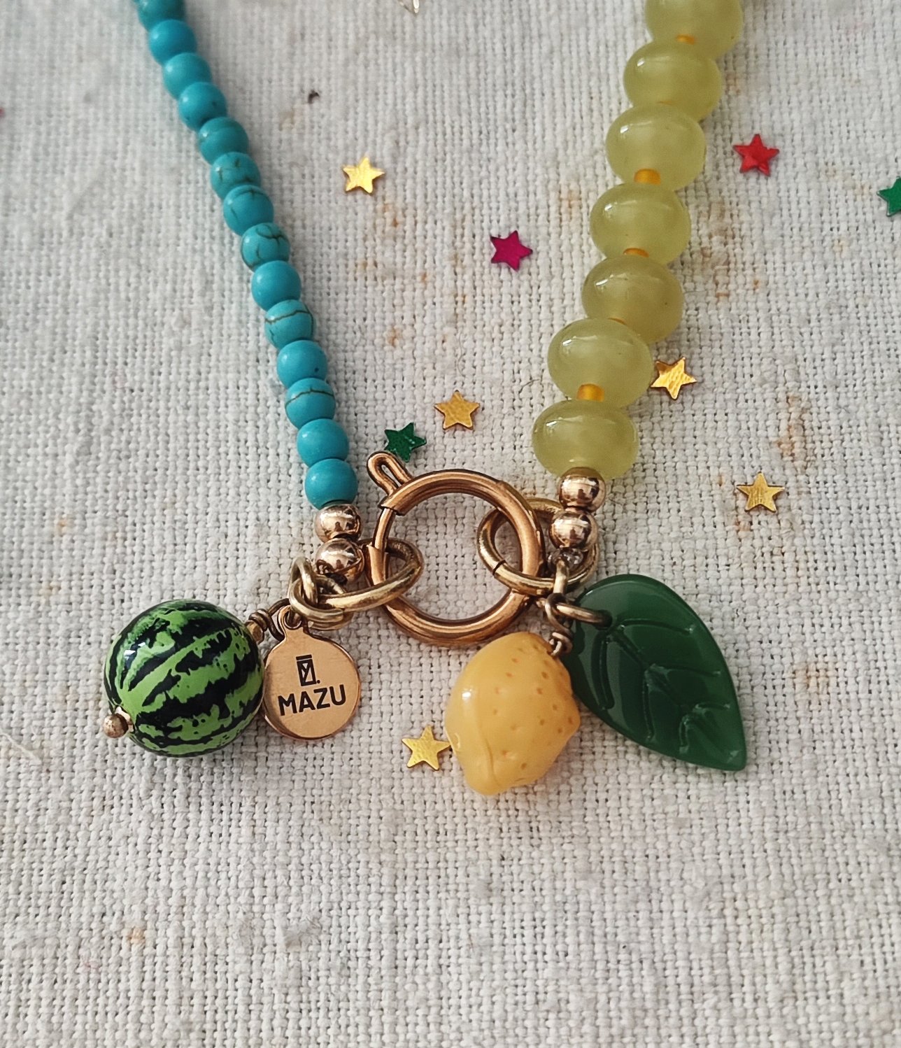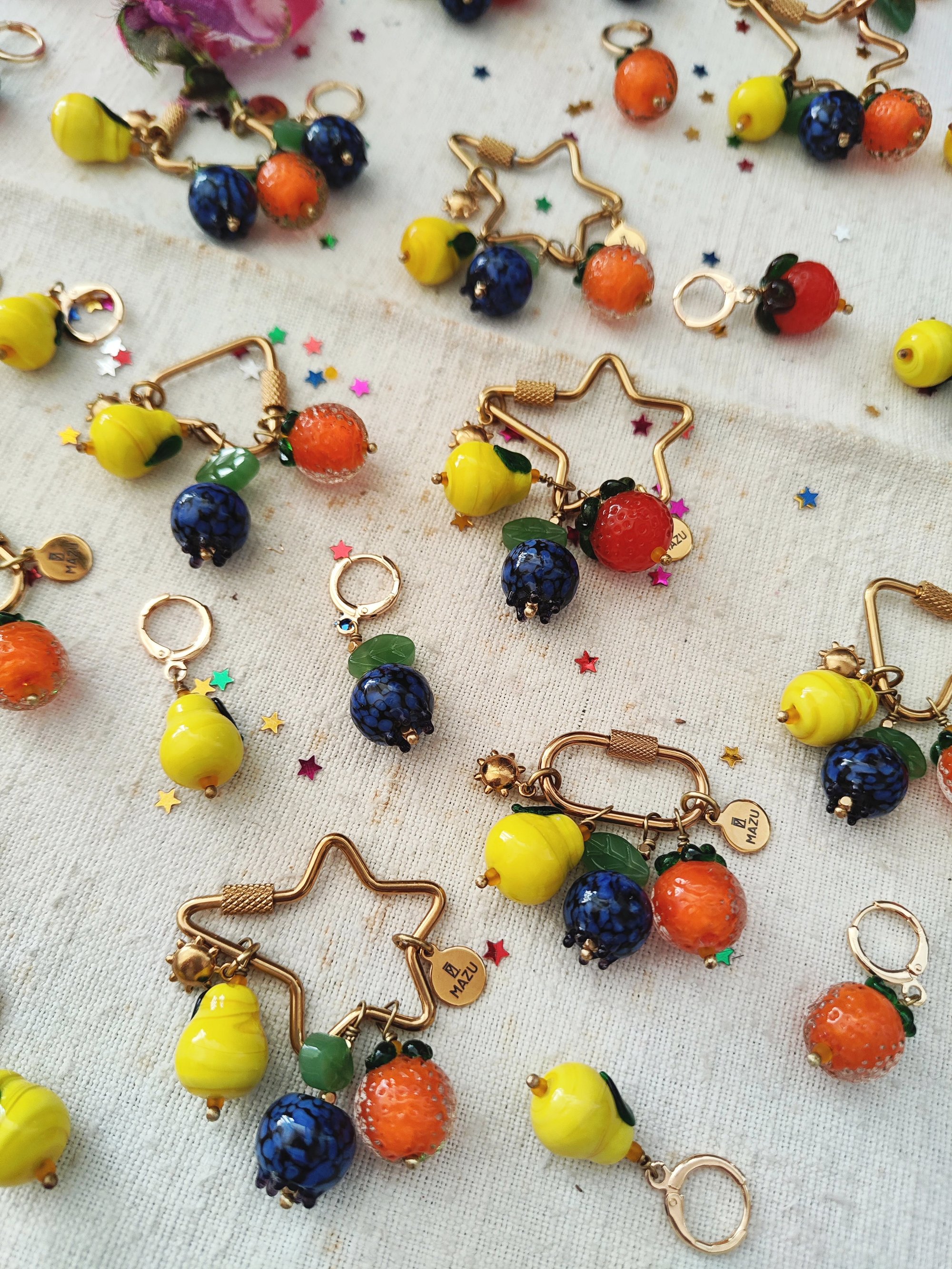 Le forme sono tre: il cuore, la stella e l'ovale. Ogni chiusura ha cinque pendenti: un piccolo sole e la targhetta MAZU in acciaio dorato, la pera, l'arancia e il mirtillo in vetro. πβ¨