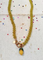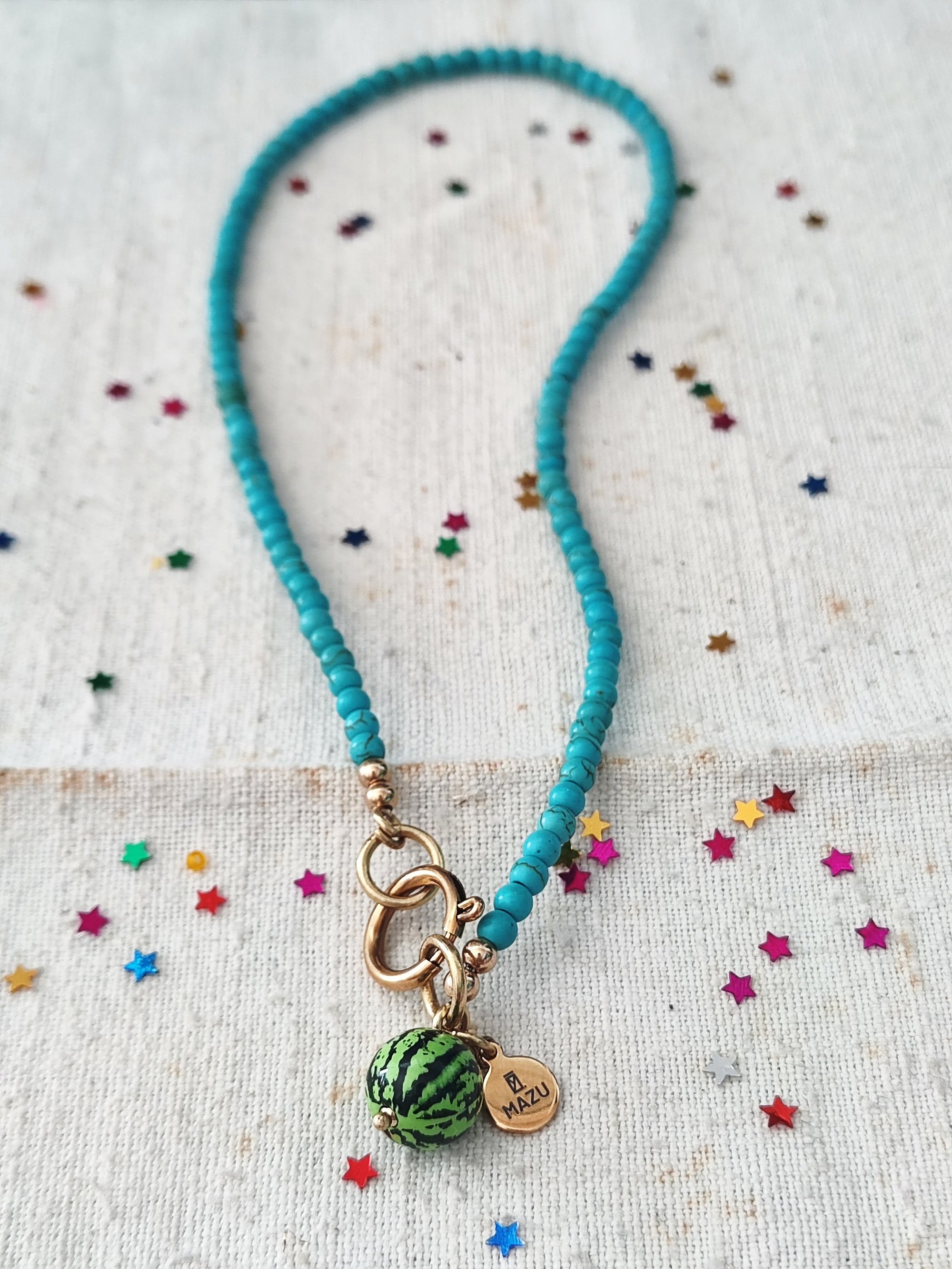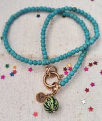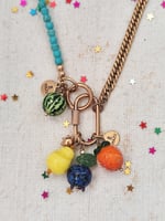 Trovate disponibili anche due collane nate come abbinamento alle chiusure tutti TUTTI FRUTTI. La collana Verde Limone in agata (lunga circa 55 cm) coni piccolo limonee la foglia verde in vetro π e la collana Turchese (lunga circa 40 cm) con una piccola anguria in resina vicino alla chiusura.πβ¨