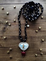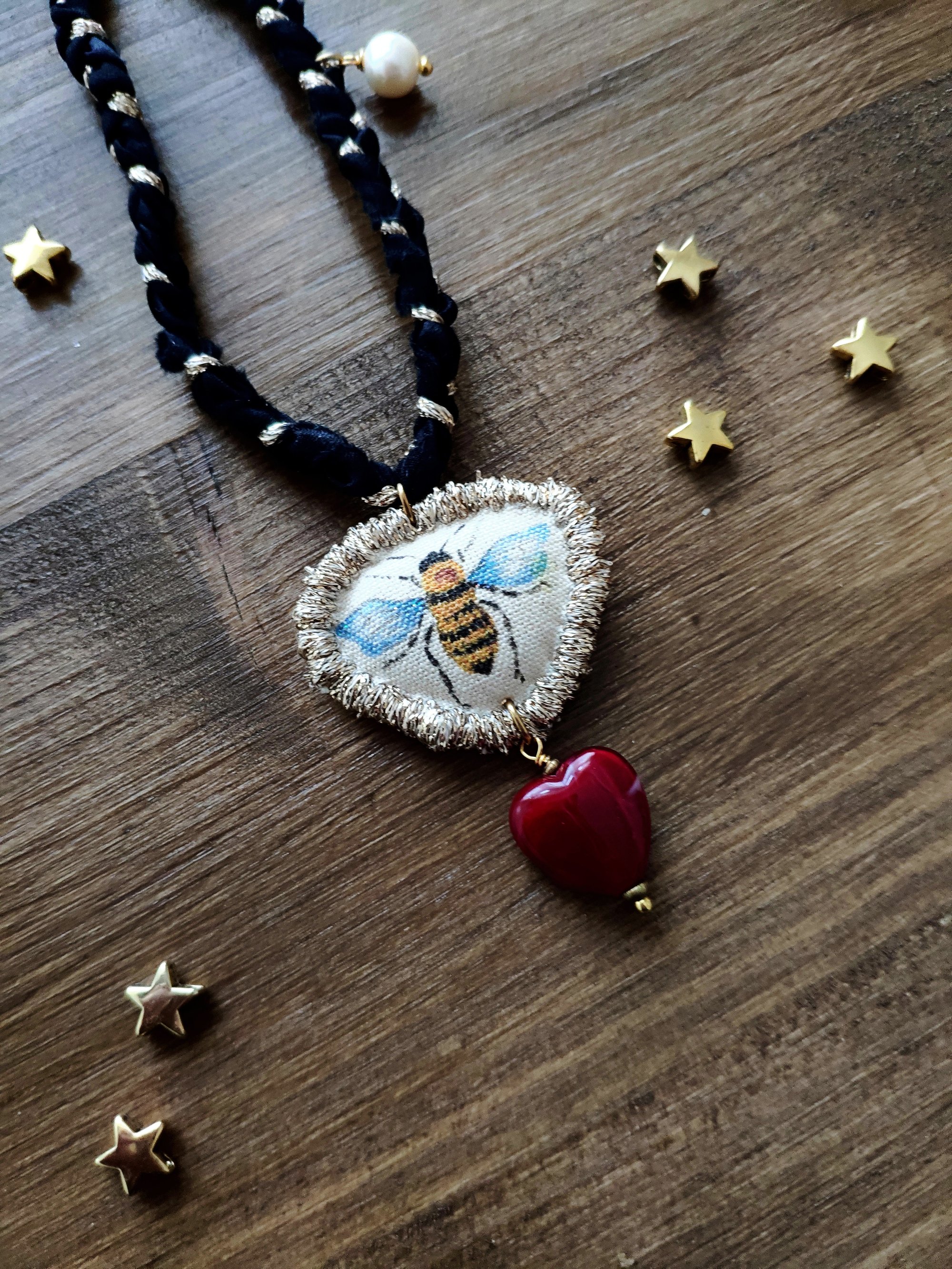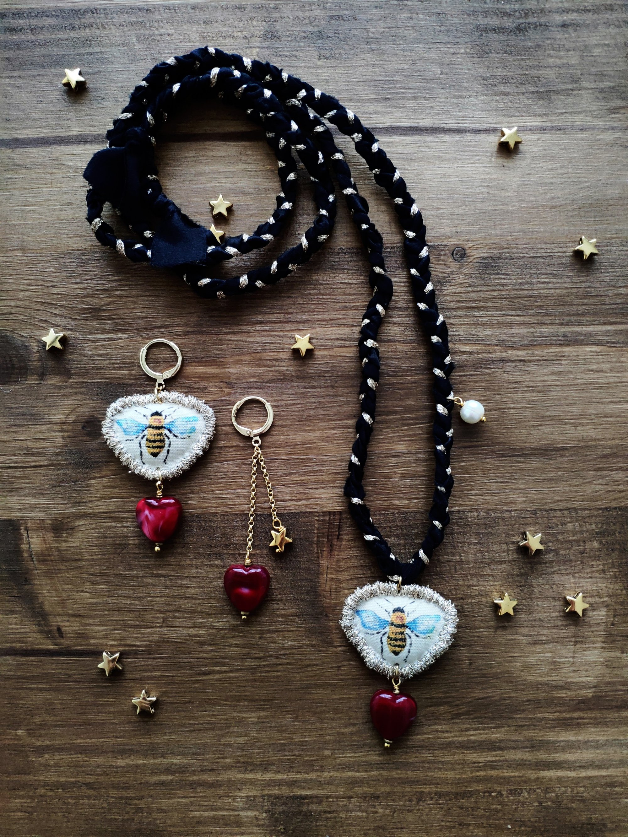 La collana 'Rinascita' fa parte della collezione Alchemica. E' fatta di nastri di seta nera intrecciati al filo dorato DMC. Il pendente è un mio disegno ad acquarello trasferito su tela da pittura, ritoccato con il colore celeste per la stoffa e rifinito con il filo dorato. Al pendente ho aggiunto un cuore in resina bordeaux. La collana può essere abbinata agli orecchini della stessa collezione.