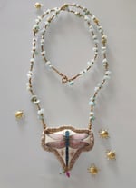 La collana 'Coraggio' fa parte della collezione Insectarium. E' fatta di perline di ottone di diverse forme e le perline in amazonite di forme irregolari. Ho aggiunto una perlina anche alla chiusura della collana, se portata a doppio giro la viene davanti. Il pendente è un mio disegno, una stampa ad altissima qualità su tela da pittura ritoccata con i colori per la stoffa, ricamata e rifinita con il filo dorato DMC.