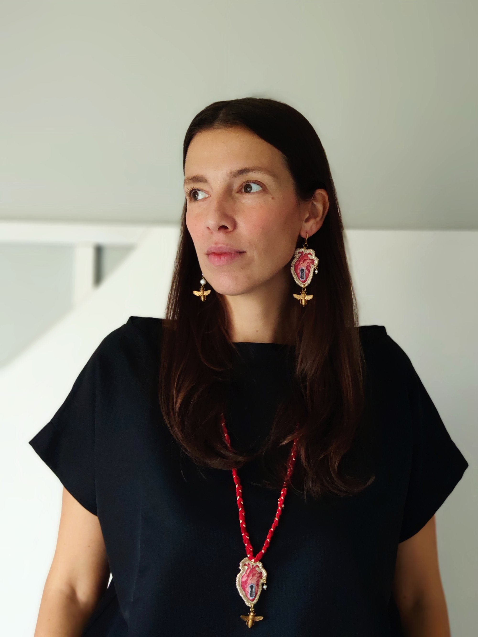 La collana è fatta di nastri di seta in due tonalità di rosso intrecciati col filo dorato DMC. Il pendente è un mio disegno ad acquarello trasferito su tela da pittura, ritoccato e rifinito con il filo dorato. Al pendente ho aggiunto un'ape in ottone e una piccola perla di fiume.