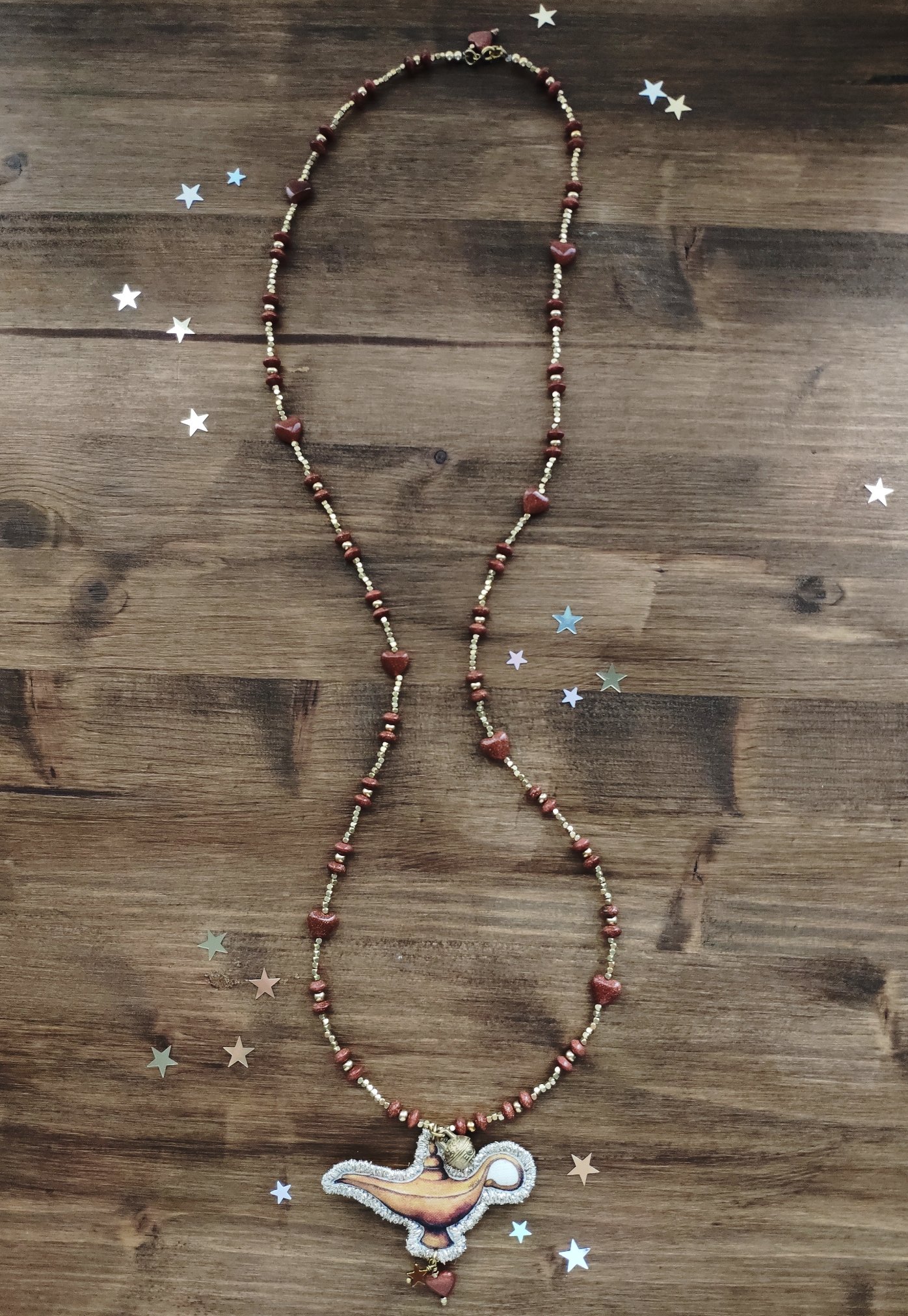 La collana 'Esprimi un desiderio!' fa parte della collezione Fiabe. E' fatta di perline di ottone di diverse forme e di perline in in vetro goldstone, ovali e a forma di cuore. Goldstone è originariamente creato quando gli alchimisti stavano lavorando per creare oro. La sua scintilla è dovuta a macchie di rame che gli donano il color arancio scuro. Ho aggiunto un cuore anche alla chiusura della collana, se portata a doppio giro la stella viene davanti. Il pendente è un mio disegno, una stampa ad altissima qualità su tela da pittura ritoccata con i colori per la stoffa e rifinita con il filo dorato DMC.