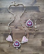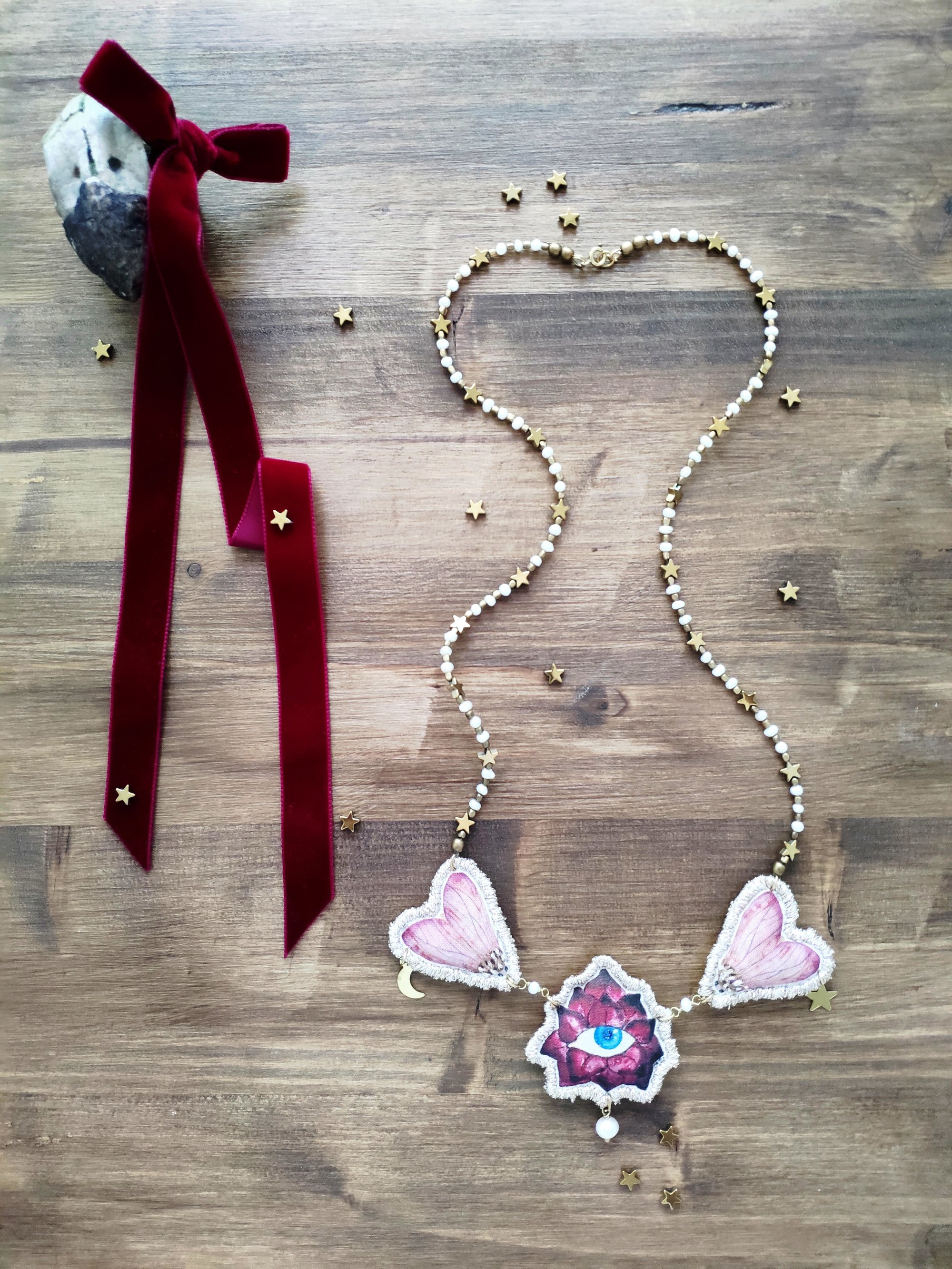 La collana 'Fiore e falena' è unione della collezione 'Secretum' e la collezione 'Nocturnia'. È fatta di piccole perle di fiume, perline in ottone e le stelline di ematite color oro antico. I pendenti sono i miei disegni ad acquarello, trasferiti su tela da pittura, con i dettagli ricamati e rifiniti con il filo dorato.