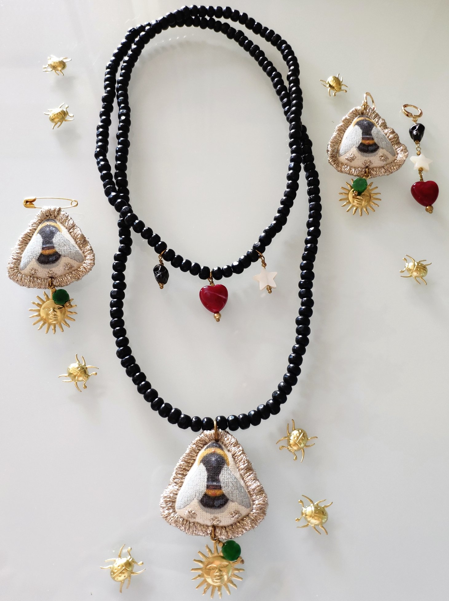 La collana Impossibile fa parte della collezione Insectarium. La collana è fatta di perline di legno (diametro circa 6 mm). Non ha la chiusura, è possibile portarla lunga con il pendente grane davanti con il sole in ottone e un piccolo quadrifoglio in giada e i tre ciondoli sulla schiena (il piccolo teschio in osso nero, il cuore in resina bordeaux e la stella in madreperla) oppure a doppio giro con i ciondoli e il pendente grande davanti. Il Bombus terrestris (comunemente chiamato bombo) è un mio disegno, una stampa di altissima qualità su tela da pittura, ritoccato con i colori per la stoffa, ricamato e rifinito con il filo dorato DMC.