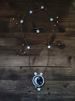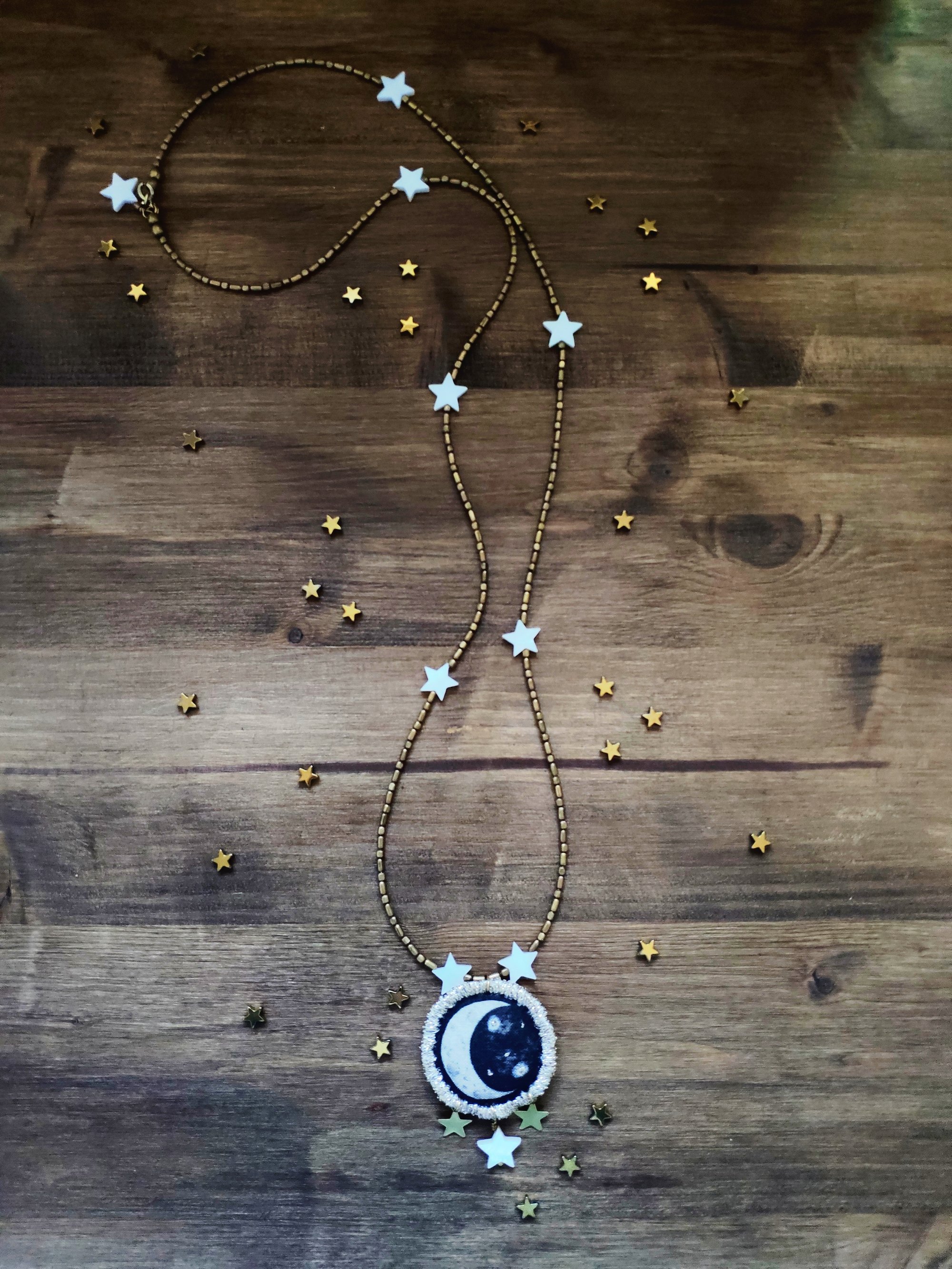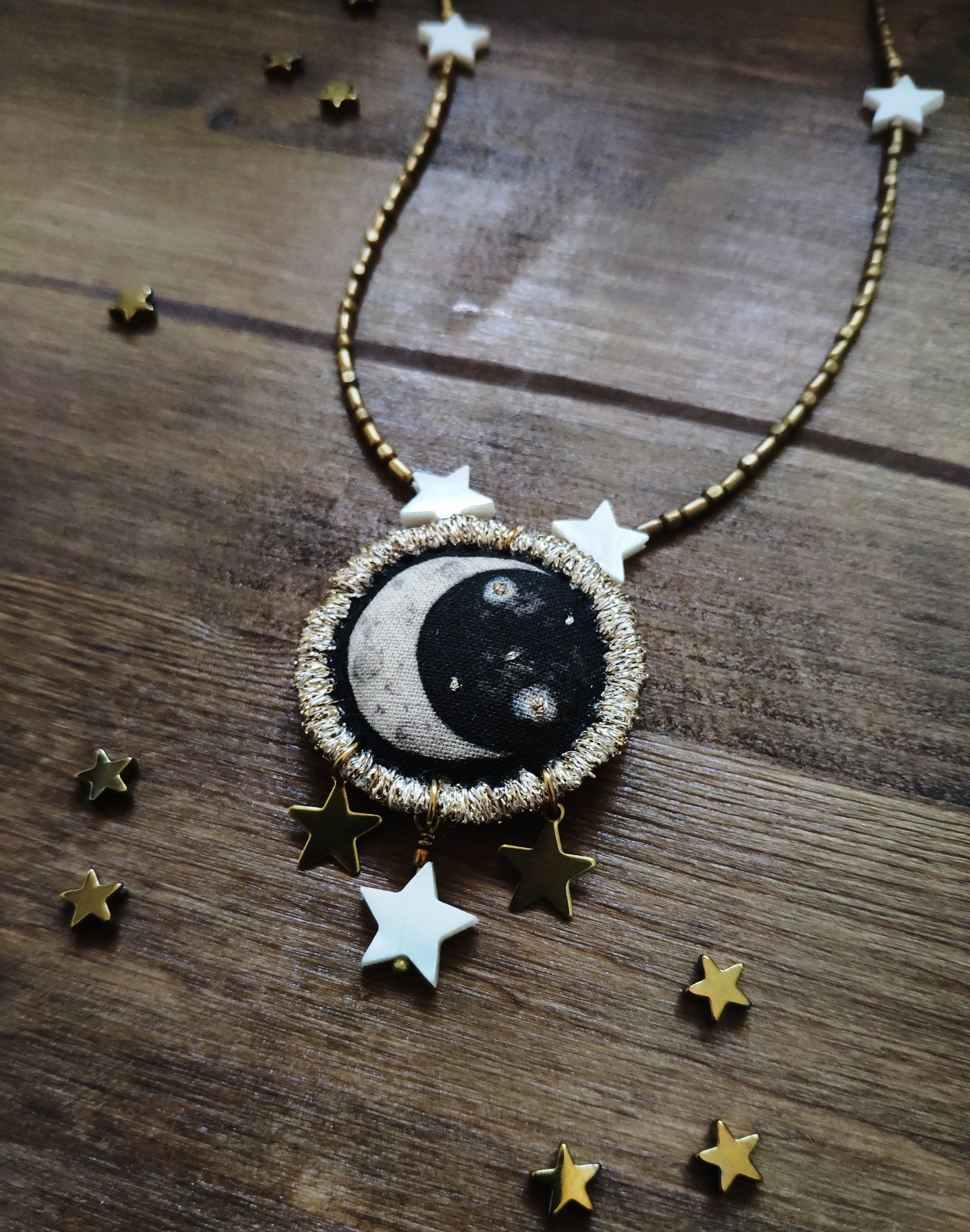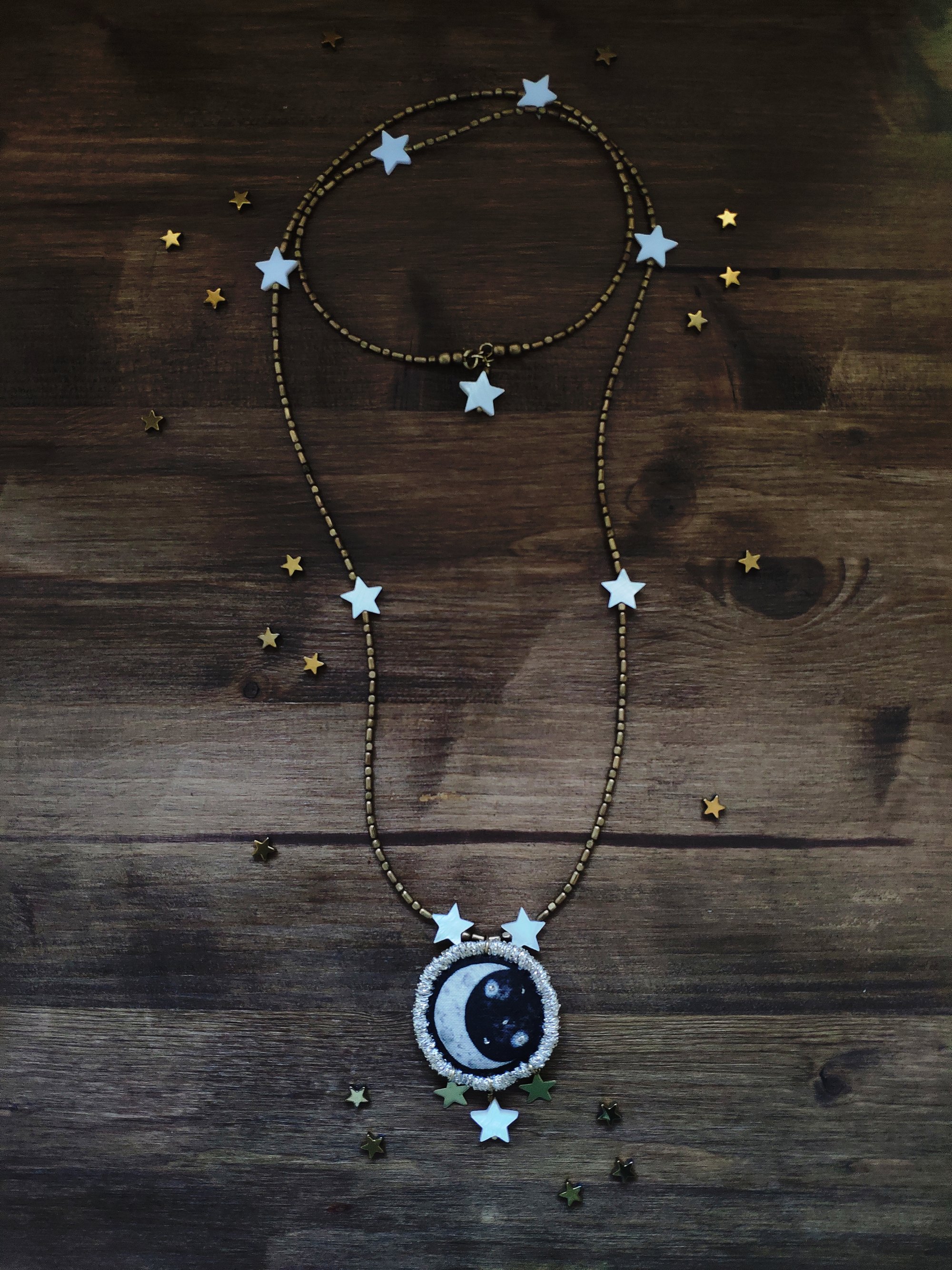 La collana 'Luna' fa parte della collezione 'Firmamento'. E fatta di perline di ottone di diverse forme e le stelline in madreperla. Ho aggiunto una stellina in più alla chiusura, se portata a doppio giro la stellina viene davanti. La Luna è un mio disegno, una stampa di altissima qualità su tela da pittura, ricamata e rifinita con il filo dorato DMC.