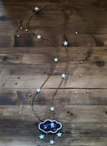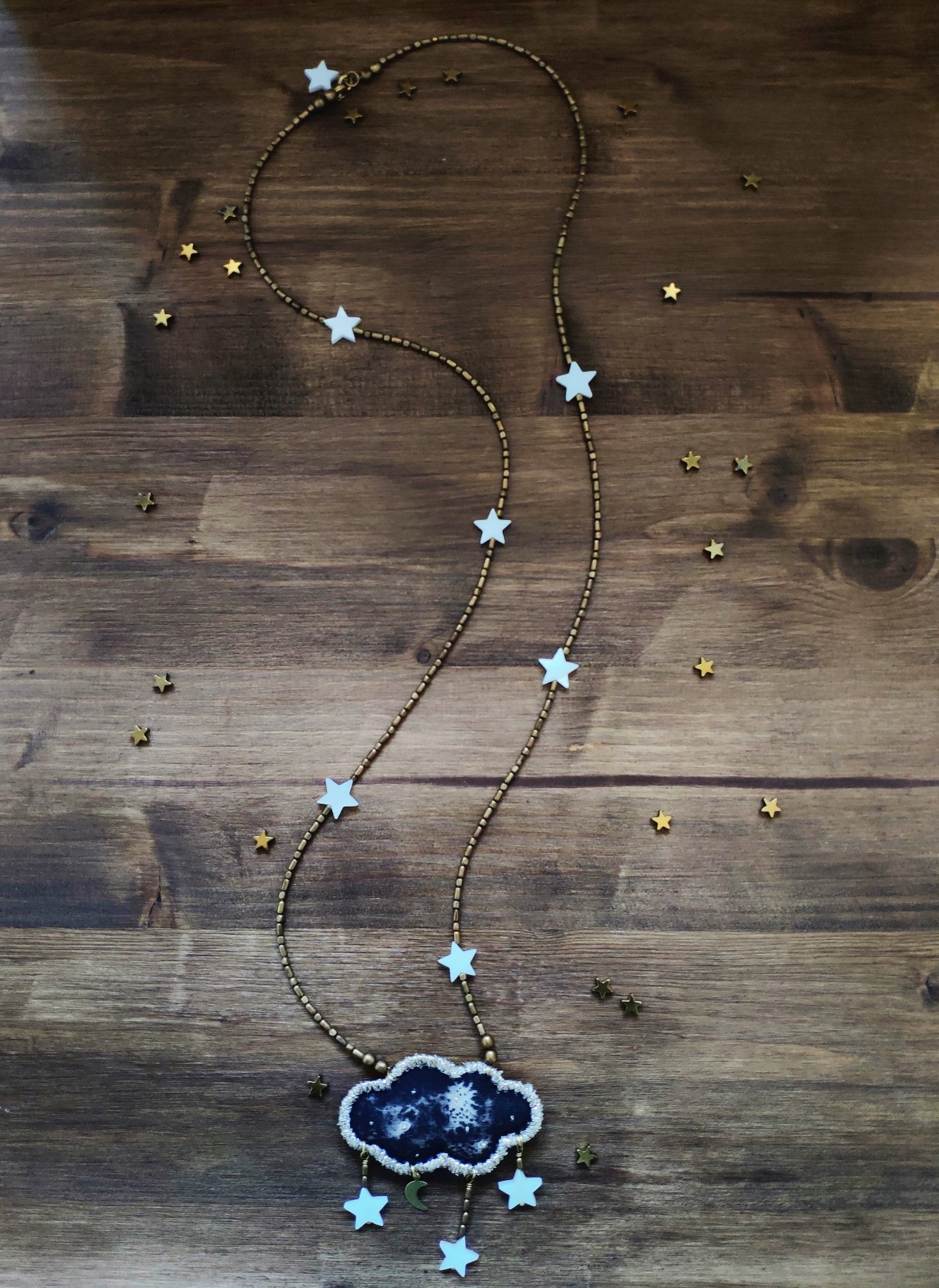 La collana 'Nebula' fa parte della collezione 'Firmamento'. E fatta di perline di ottone di diverse forme e le stelline in madreperla. Ho aggiunto una stellina in più alla chiusura, se portata a doppio giro la stellina viene davanti. La nuvola è un mio disegno, una stampa di altissima qualità su tela da pittura, ricamata e rifinita con il filo dorato DMC.