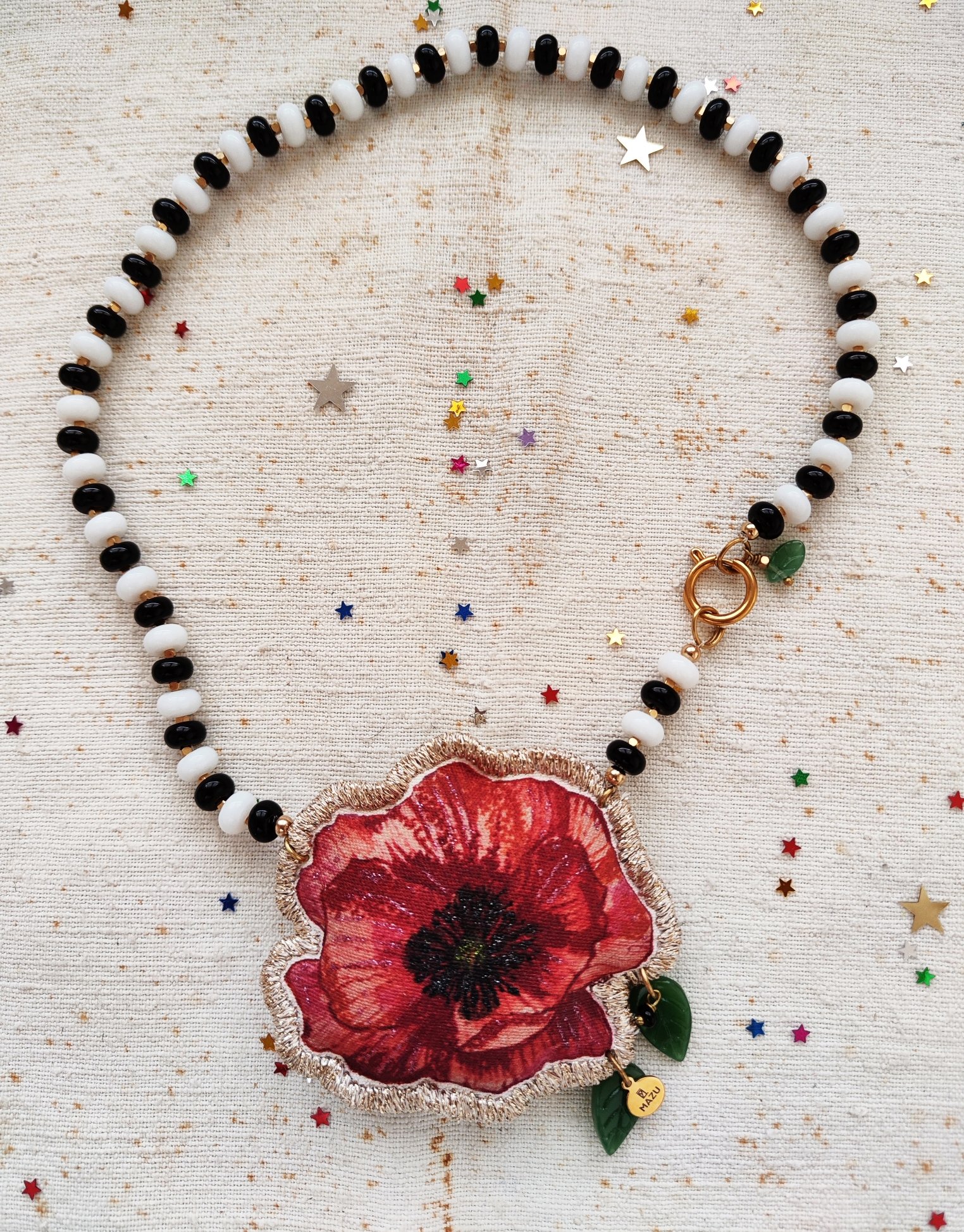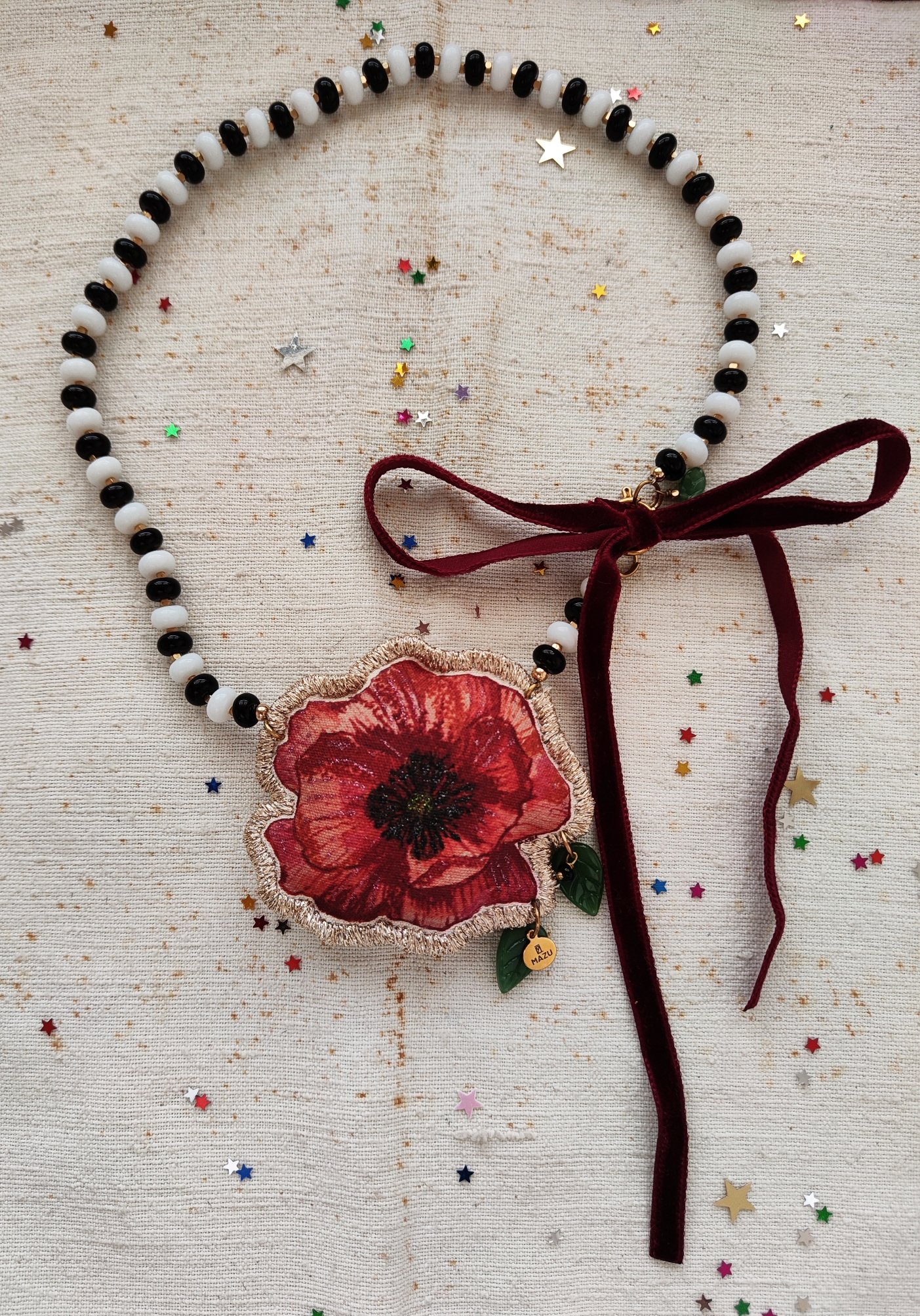La collana Papavero fa parte della collezione Antologia. Il Papavero è un mio disegno trasferito su tela da pittura attraverso la stampa di altissima qualità. Il disegno poi è ritoccato con i colori per la stoffa scintillanti e rifinito con il filo dorato DMC. La collana è composta da perline in vetro nere e bianche e perline in ottone.