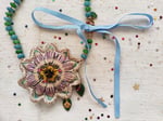 La collana Passiflora fa parte della collezione Antologia. La Passiflora è un mio disegno trasferito su tela da pittura attraverso la stampa di altissima qualità. Il disegno poi è ritoccato con i colori per la stoffa scintillanti e rifinito con il filo dorato DMC. La collana è composta di due pietre, il calcedonio (tipologia di quarzo) celeste e la giada verde e perline in ottone.