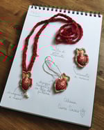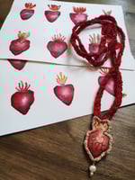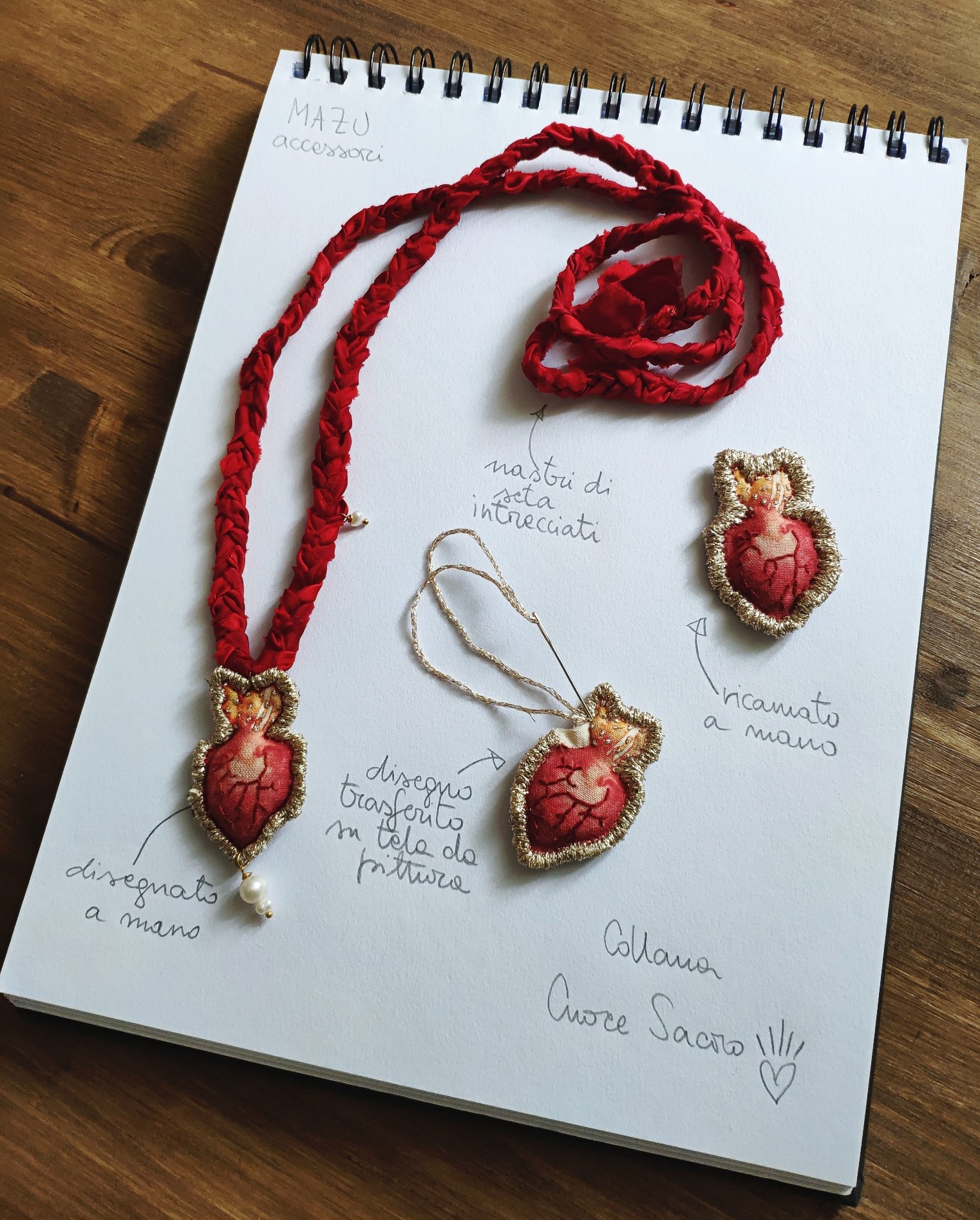 La collana 'Cuore Sacro' fa parte della collezione Memento Mori. E' fatta di nastri di seta in due tonalità di rosso/bordeaux intrecciati. Il pendente è un mio disegno trasferito su tela da pittura, le arterie sono ricamate a mano come anche le scintille di fuoco ed è rifinito con il filo dorato. Al pendente ho aggiunto due perle di fiume in grandezze diverse.