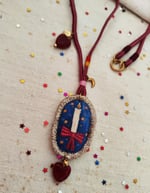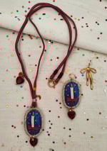 La collana è fatta di cordoncino di setta piatto color rosa antico, rifinito e decorato con i fili da ricamo DMC.