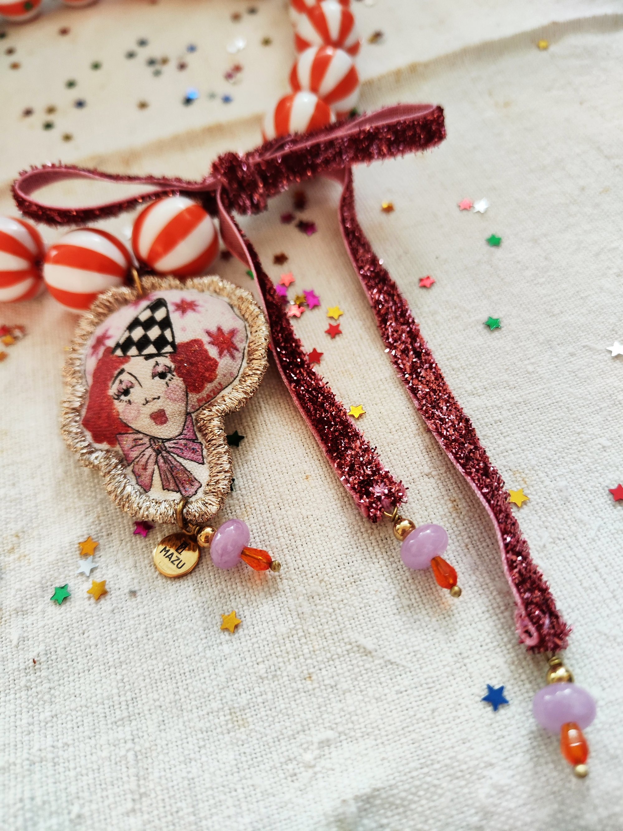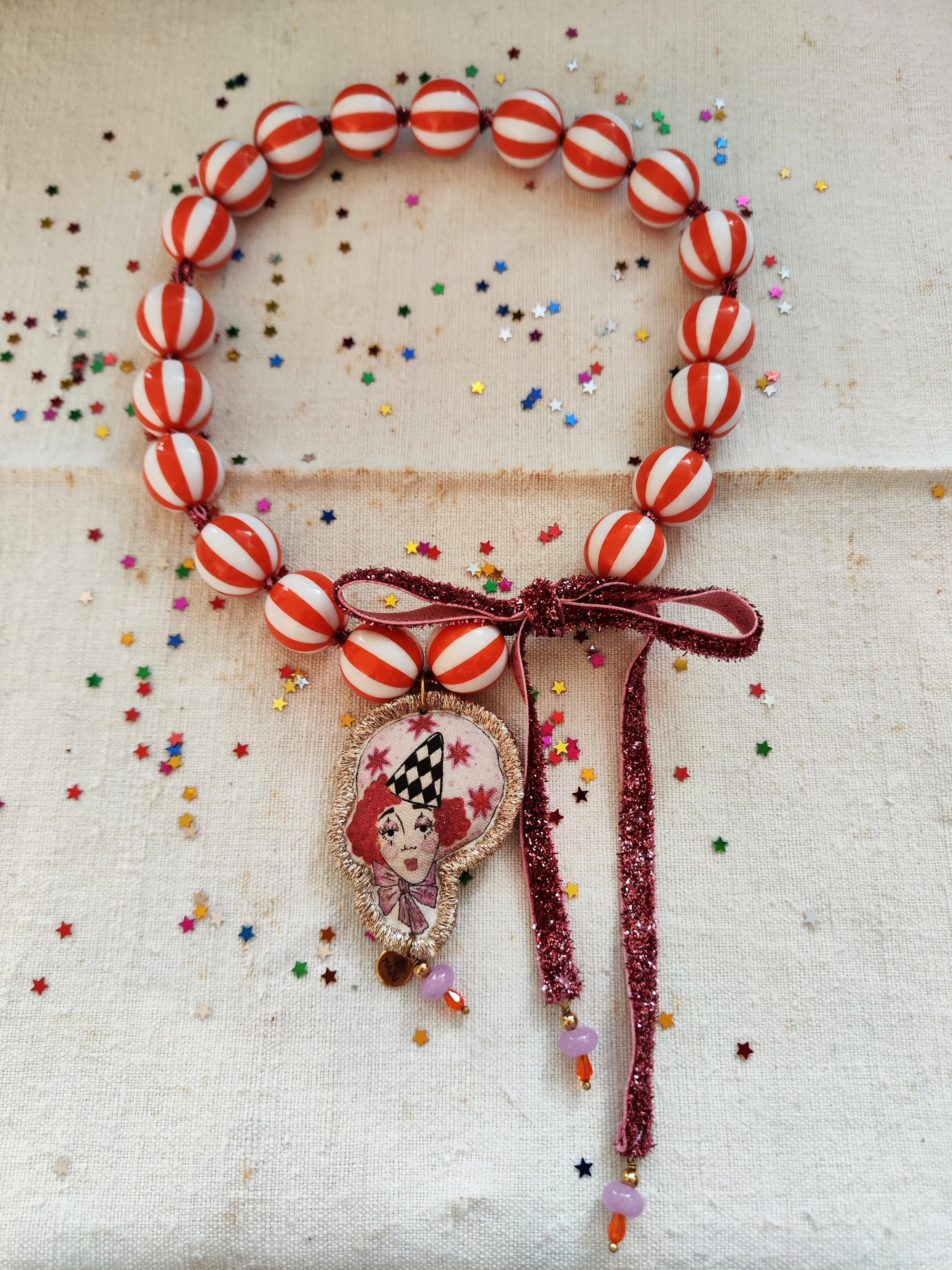 Sono disponibili due modelli della collana: le perline in resina lilla e bianche infilate su un nastro scintillante argentato 🩶 oppure il pendente su un laccio in lurex rosa 🩷.