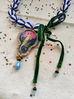 Sono due modelli di collana, con le perle grandi blu e bianche infilate sul nastro verde scintillante di circa 100cm e con il laccio in lurex verde di circa 130cm. ππ