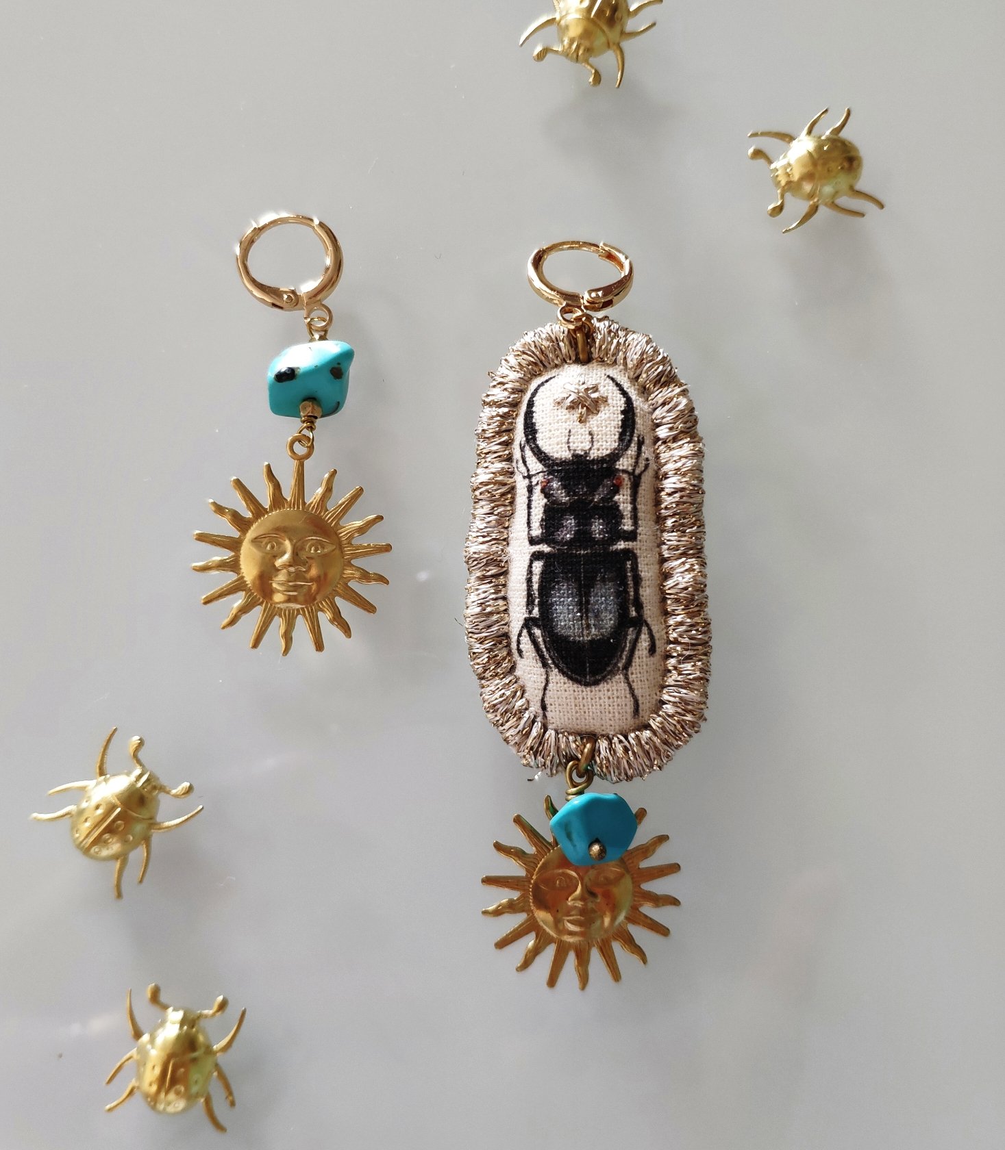 Gli orecchini 'Cervo Volante' fanno parte della collezione Insectarium. Volutamente asimmetrici, un orecchino ha come pendente la libellula che è un mio disegno ad acquarello trasferito su tela da pittura, ritoccato e rifinito con il filo dorato. Al pendente ho aggiunto una pietra in pasta di turchese e un sole in ottone. L'altro orecchino ha le stesse perline.