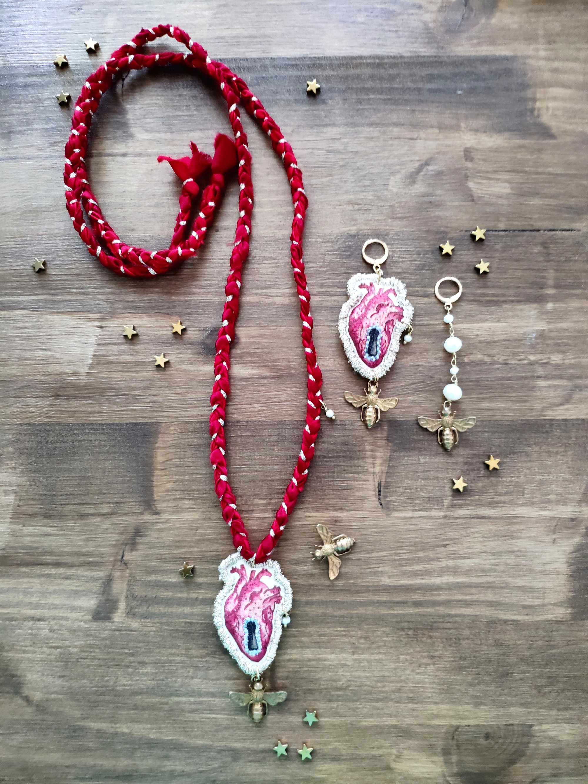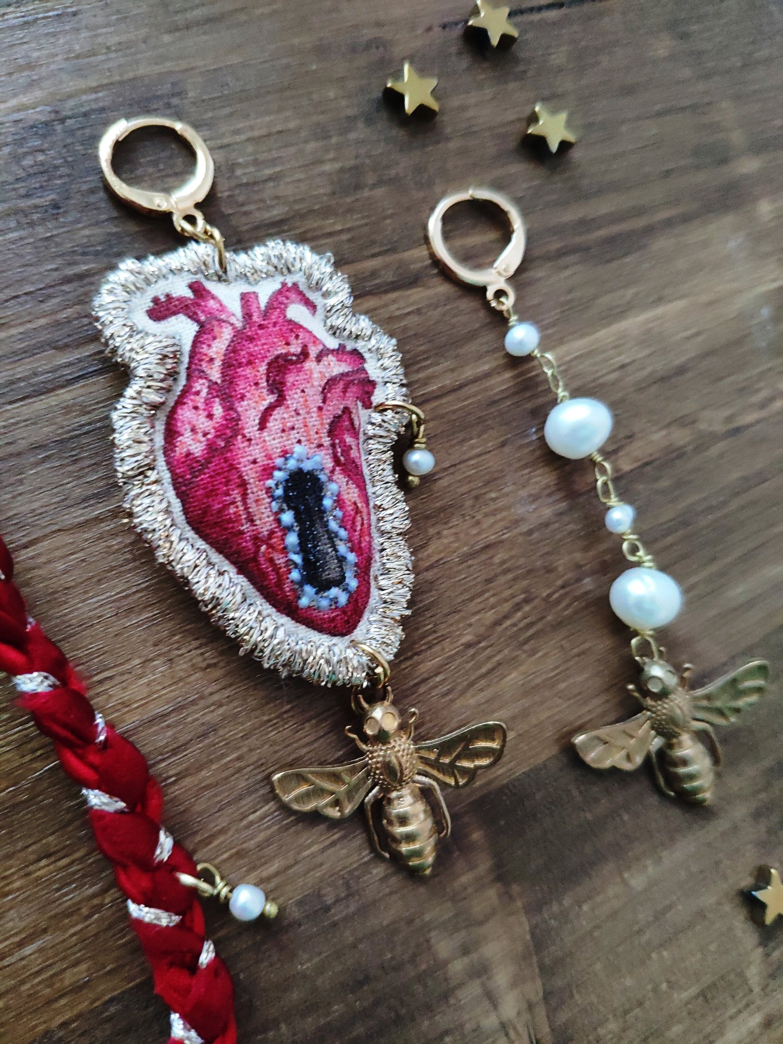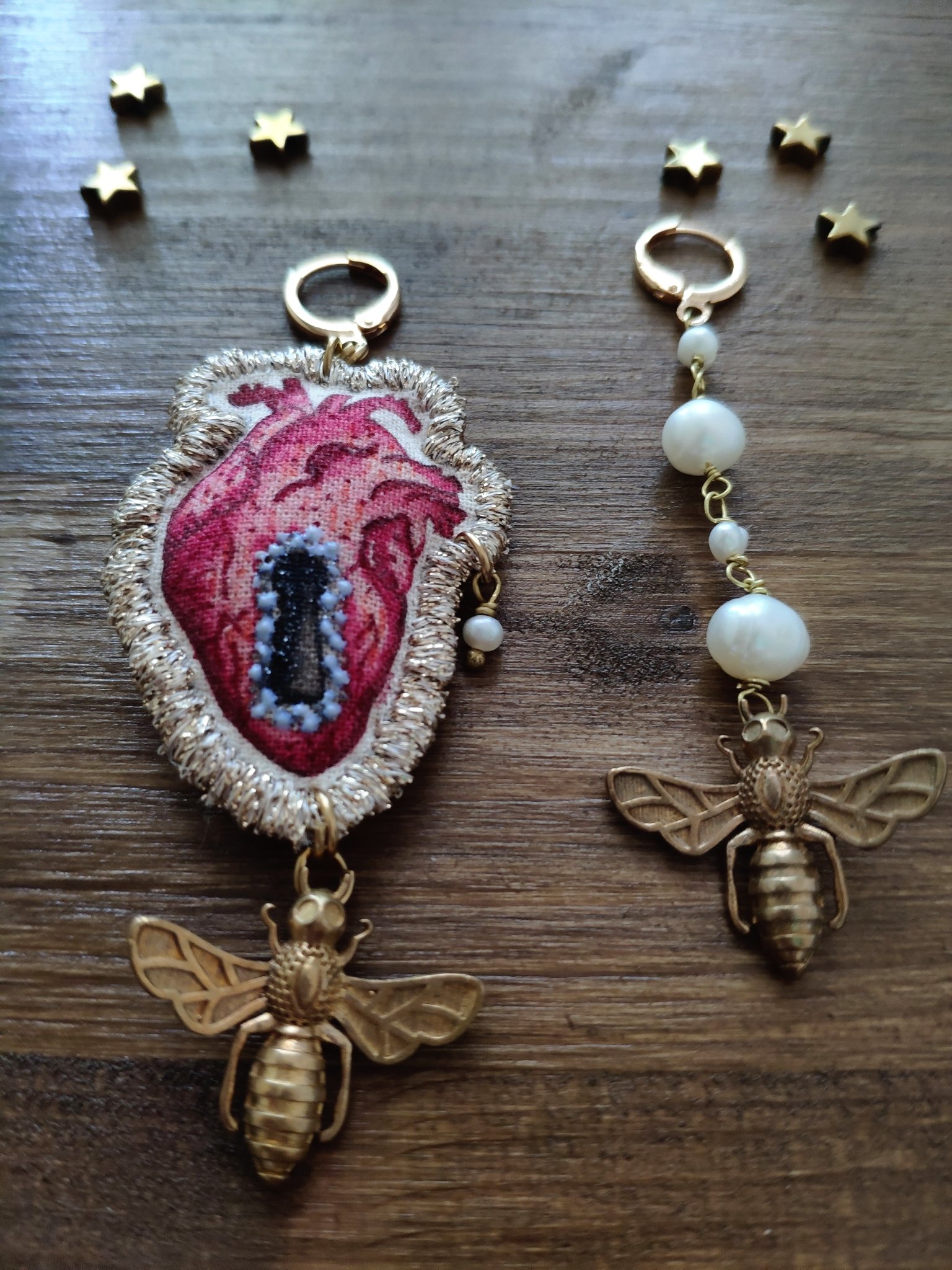 Volutamente asimmetrici, un orecchino ha come pendente il Cuore che è un mio disegno trasferito su tela da pittura, ritoccato e rifinito con il filo dorato. Al pendente ho aggiunto un'ape in ottone e una piccola perla di fiume. L'altro orecchino ha la catenina in ottone con le perline di fiume e l'ape in ottone.