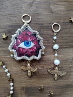 Volutamente asimmetrici, un orecchino ha come pendente il Fiore che è un mio disegno trasferito su tela da pittura, ritoccato e rifinito con il filo dorato. Al pendente ho aggiunto un'ape in ottone e due piccole perle di fiume. L'altro orecchino ha la catenina in ottone con le perline di fiume e l'ape in ottone.