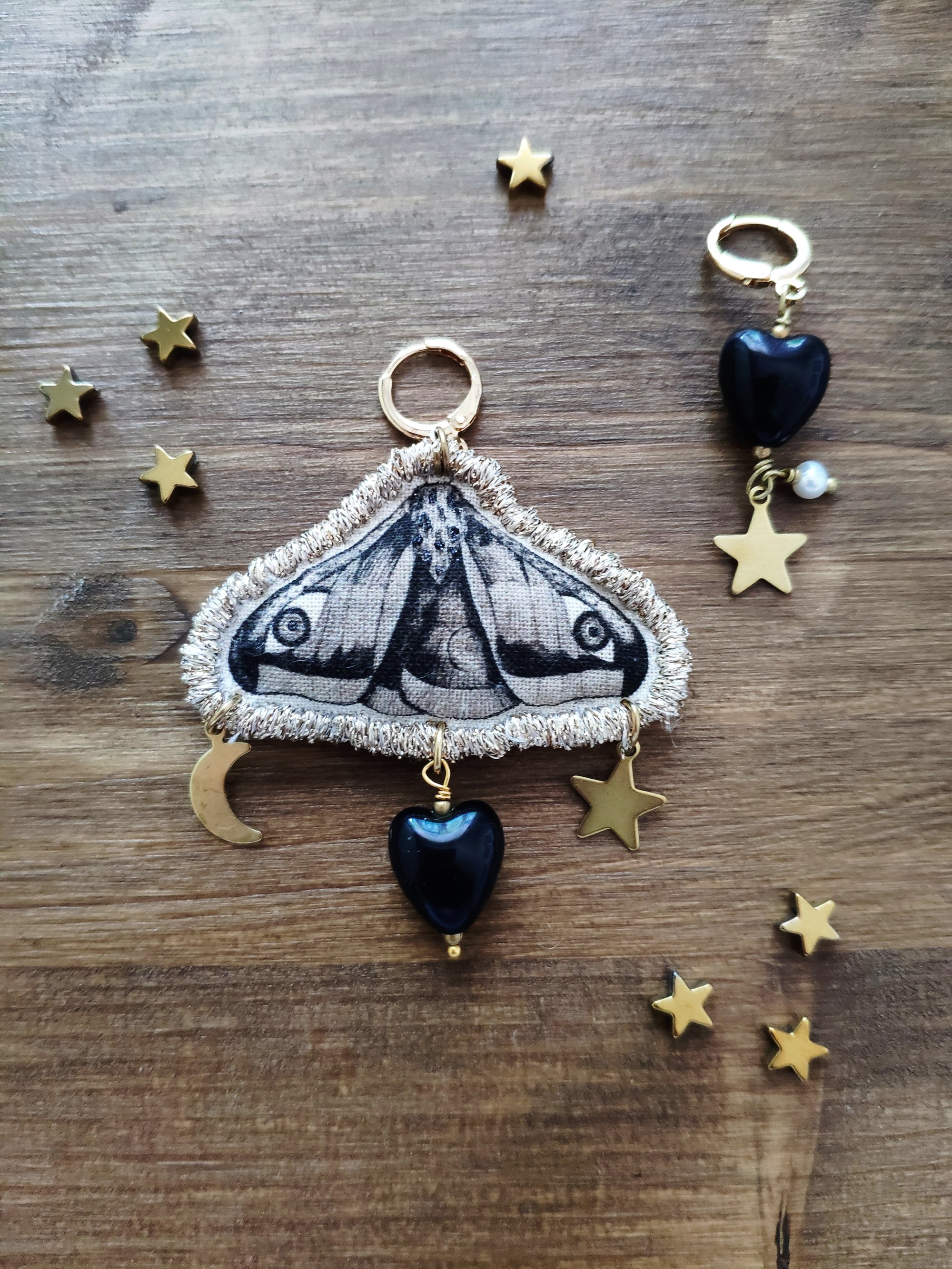 Volutamente asimmetrici, un orecchino ha come pendente la Falena Imperatrice che è un mio disegno trasferito su tela da pittura, ritoccato e rifinito con il filo dorato. Al pendente ho aggiunto un cuore in ceramica smaltata, una luna e una stella in ottone. L'altro orecchino ha il cuore in ceramica, la stella in ottone e una piccola perla di fiume.