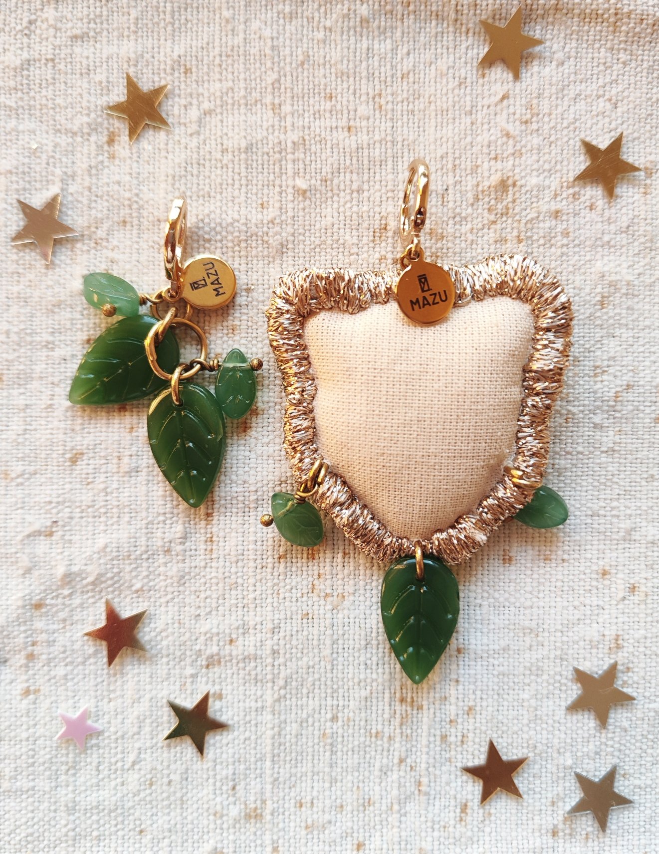 Volutamente assimetrici, un orecchino ha il pendente con il disegno con delle piccole foglie di vetro e resina e l'altro gli stessi elementi con una foglia più grande. Sul retro trovate le nuove targhette dorate MAZU. 🥰