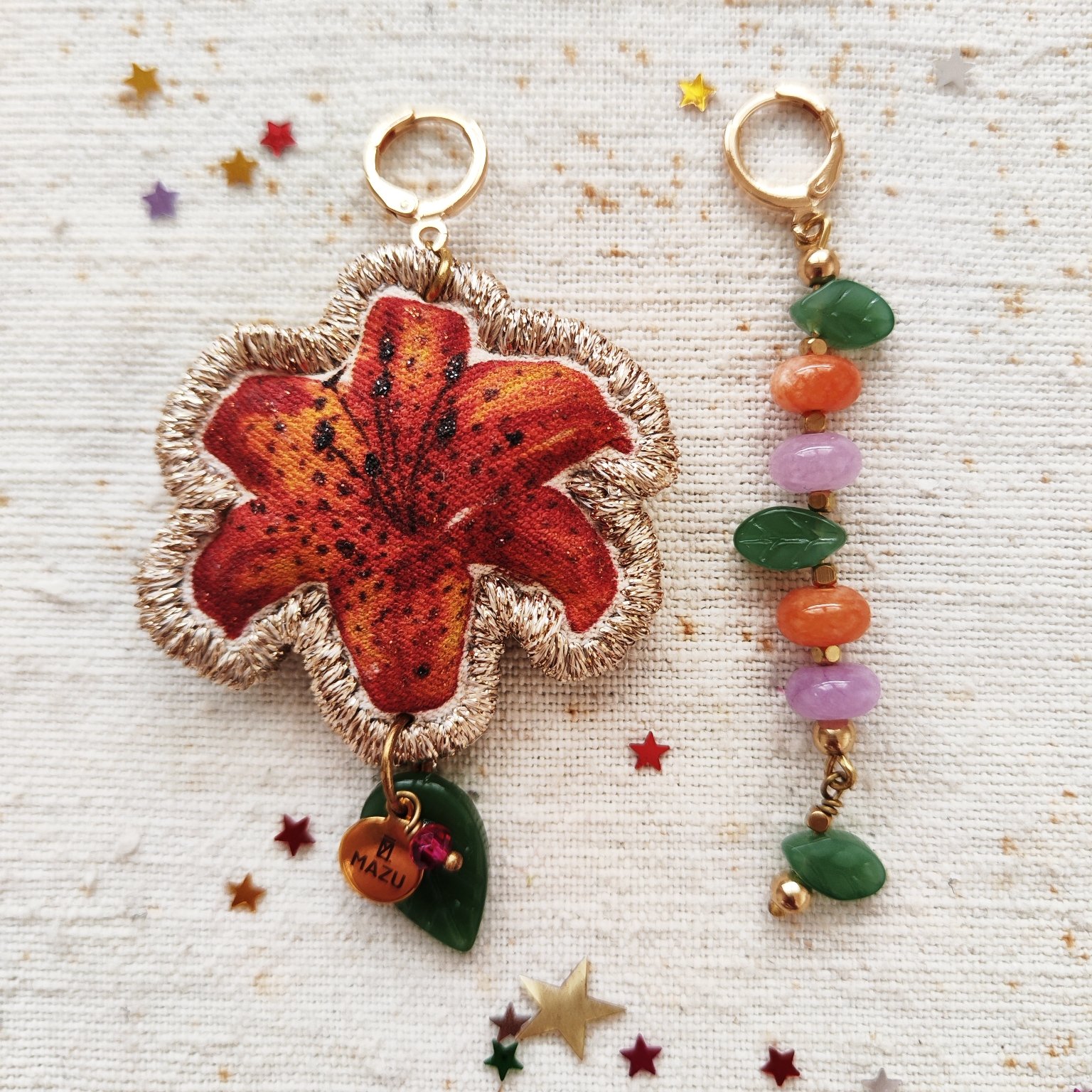 Gli orecchini Giglio Tigrato fanno parte della collezione Antologia. Il fiore è un mio disegno, una stampa di altissima qualità su tela da pittura, ritoccata con i colori per la stoffa e rifinita con il filo dorato DMC. Al pendente ho aggiunto una foglia di vetro, la targhetta MAZU e una perlina di vetro nera. Volutamente asimmetrici, l'altro orecchino è composto da due pietre, il calcedonio (tipologia di quarzo) lilla e la giada arancione.