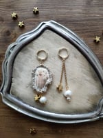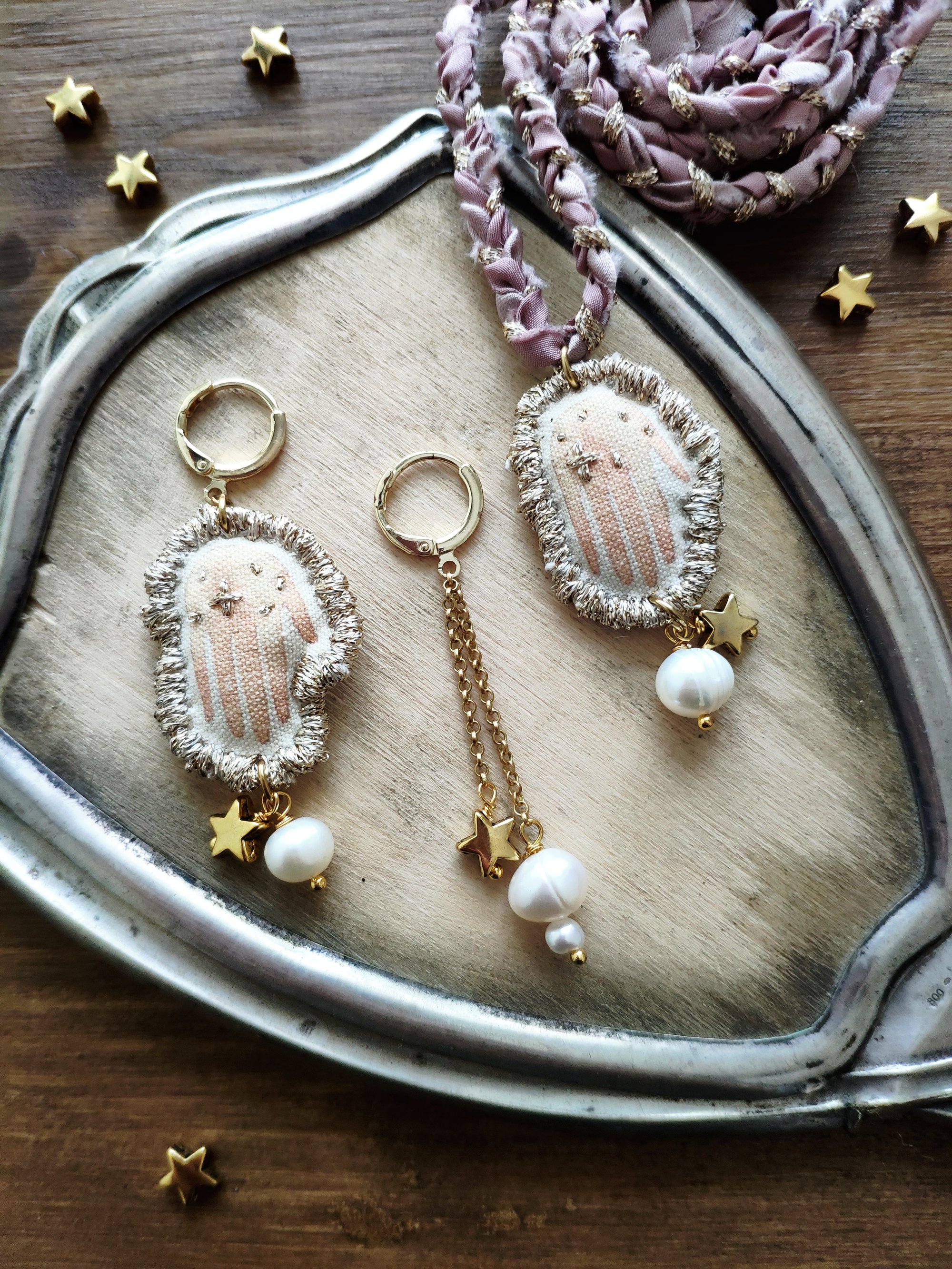 Orecchino 'Mano' fa parte della collezione Alchemica. Volutamente asimmetrici, un orecchino ha come pendente la mano che è un mio disegno ad acquarello trasferito su tela da pittura, ritoccato e rifinito con il filo dorato. Al pendente ho aggiunto una perla di fiume e una stellina color oro. L'altro orecchino ha le stesse perline appese alla catenina in ottone.