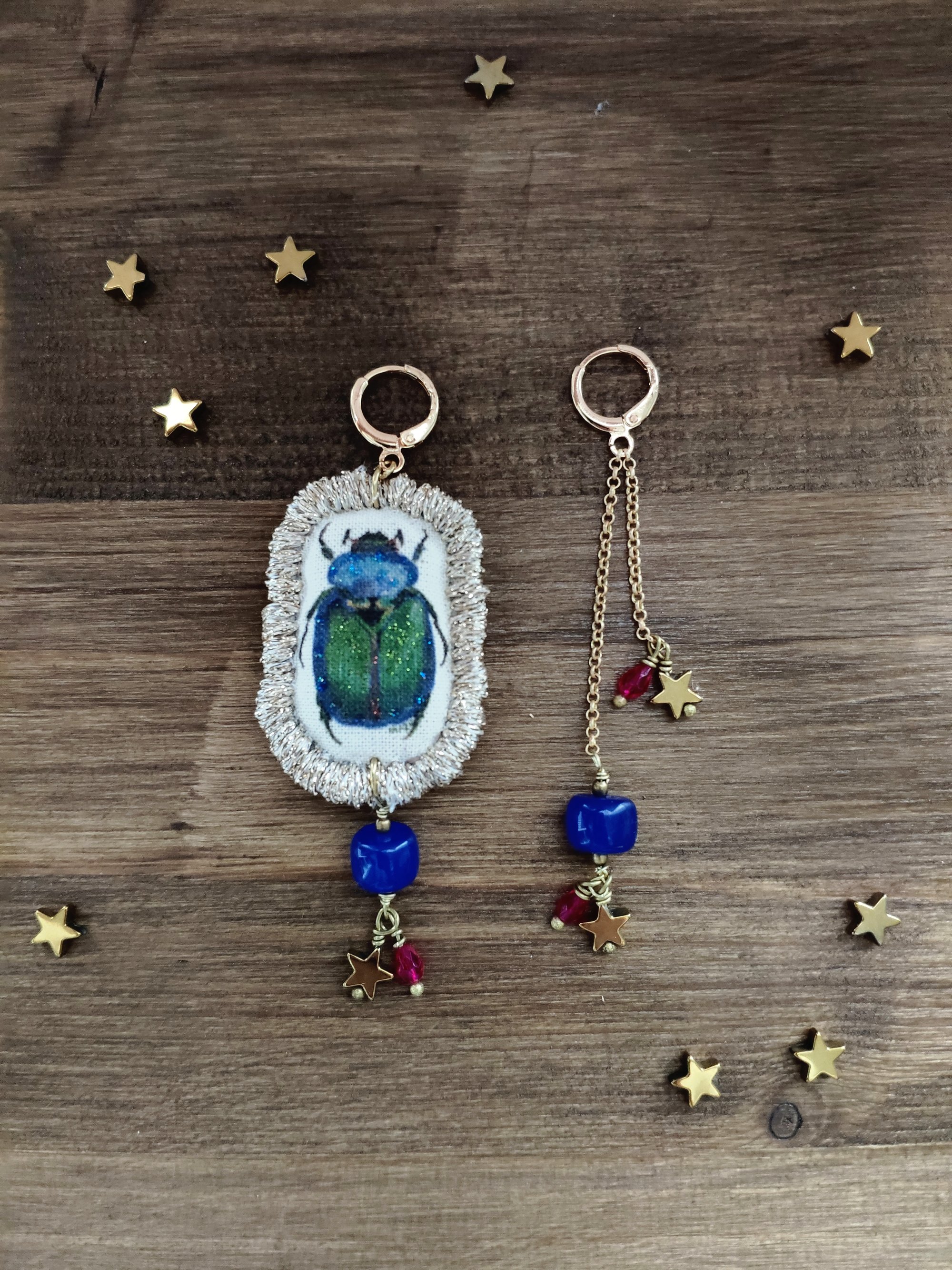 Gli orecchini 'Scarabeo' fanno parte della collezione 'Insectarium'. Lo scarabeo è un mio disegno, una stampa di altissima qualità su tela da pittura, ritoccata con i colori per la stoffa e rifinita con il filo dorato DMC. Al pendente ho aggiunto una perlina di vetro blu, una a goccia più piccola fucsia e una stellina in ematite. L'altro orecchino ha le stesse perline appese alla catenina in ottone.