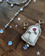 Gli orecchini 'Scegli la gentilezza' fanno parte della collezione Fiabe. Volutamente asimmetrici, un orecchino ha come pendente la rosa sotto la campana di vetro che è un mio disegno ad acquarello trasferito su tela da pittura, ritoccato e rifinito con il filo dorato.  Al pendente ho aggiunto una stellina in ematite e il cuore in opale. L'altro orecchino ha le stesse perline appese alla catenina in ottone.