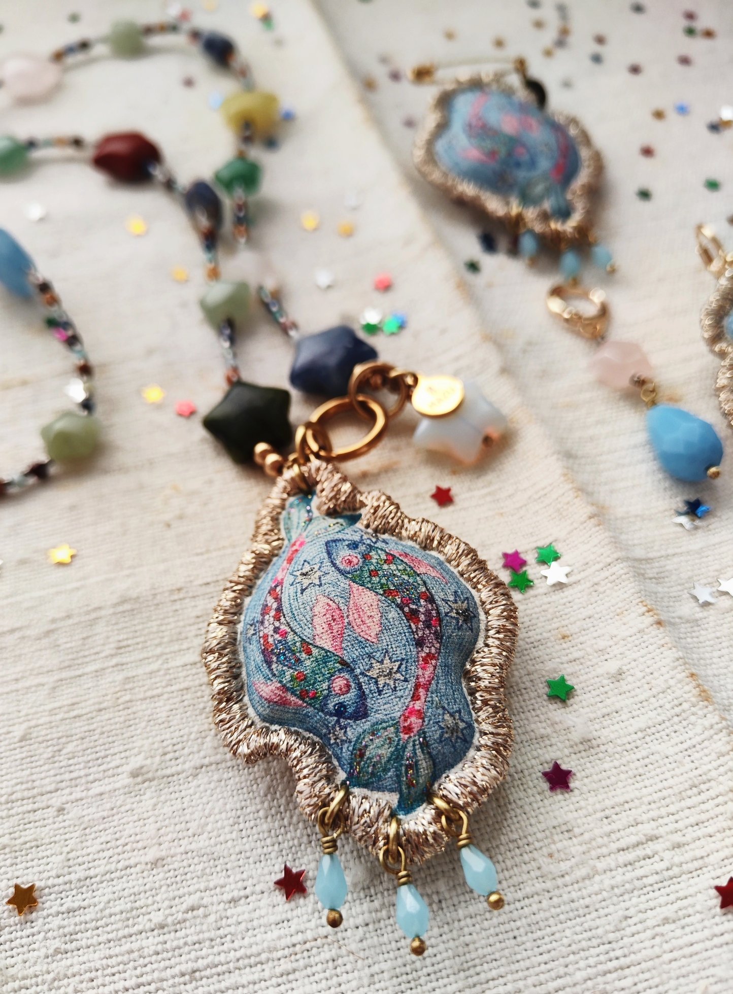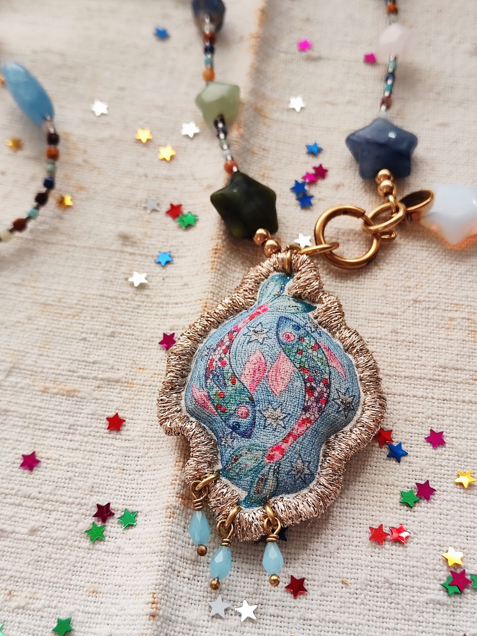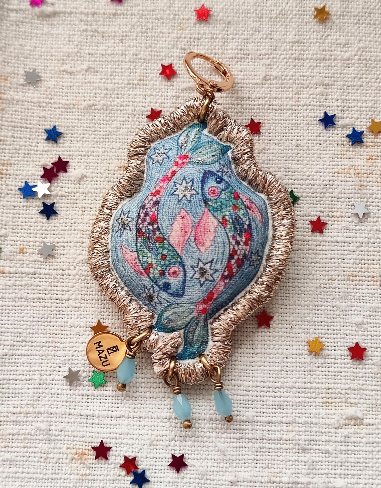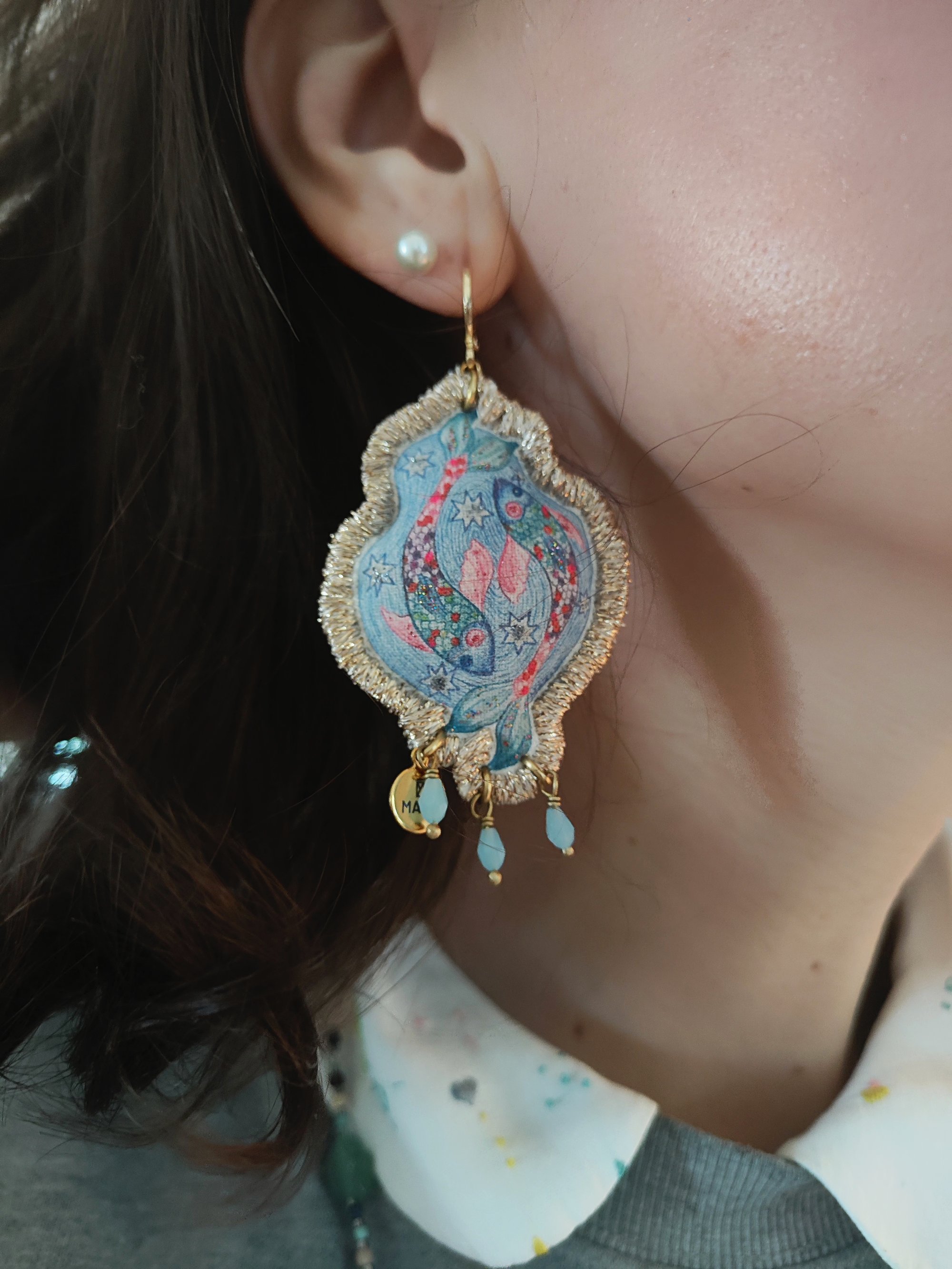 Alla fine, arriviamo al pendente! Come sempre, è un mio disegno, trasferito su tela in cotone vintage successivamente ritoccato con i colori scintillanti per il tessuto ✨. Al pendente ho aggiunto le tre piccole gocce in vetro celeste.💧