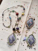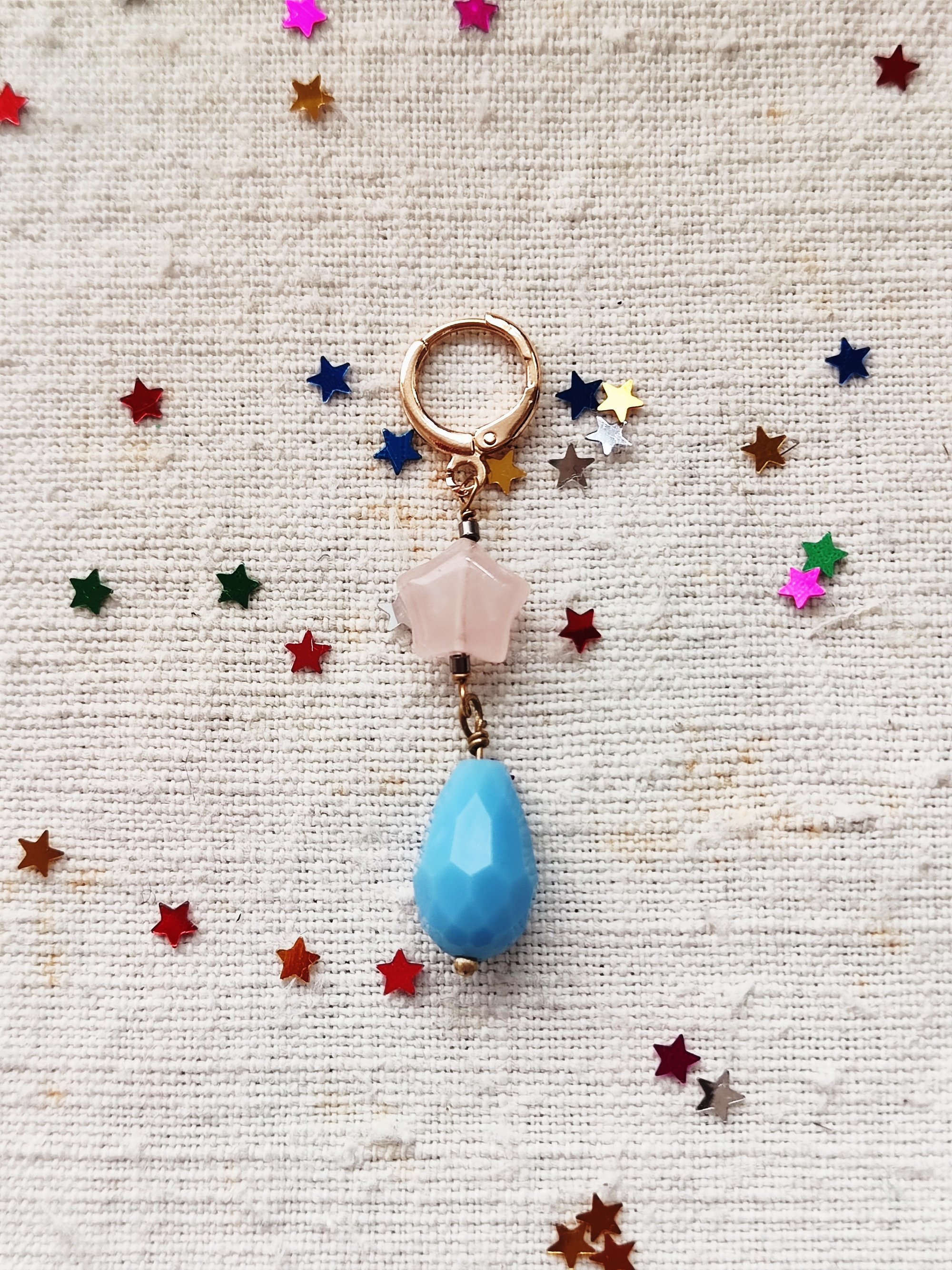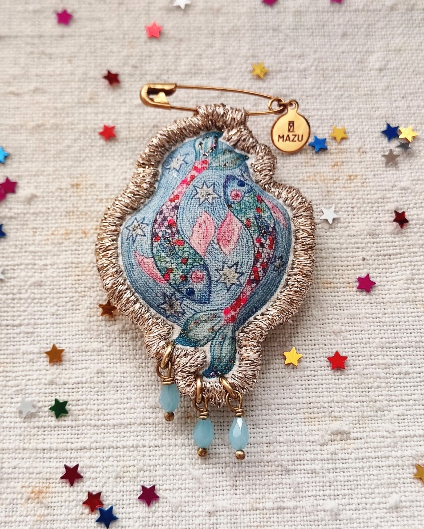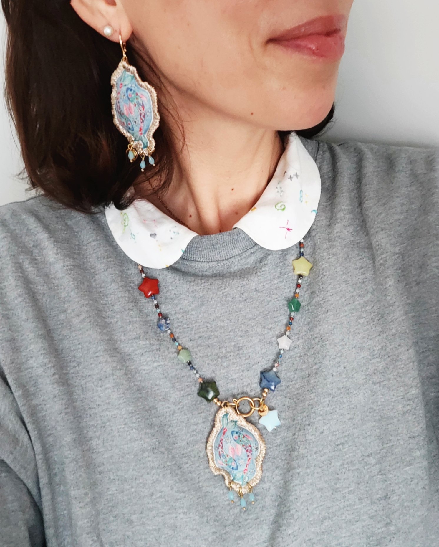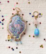 Alla fine, arriviamo al pendente! Come sempre, è un mio disegno, trasferito su tela in cotone vintage successivamente ritoccato con i colori scintillanti per il tessuto ✨. Al pendente ho aggiunto le tre piccole gocce in vetro celeste.💧