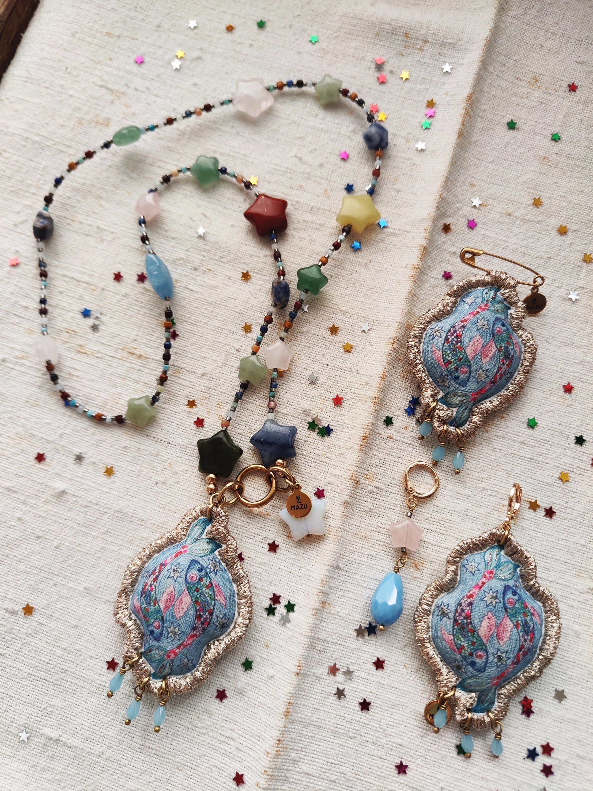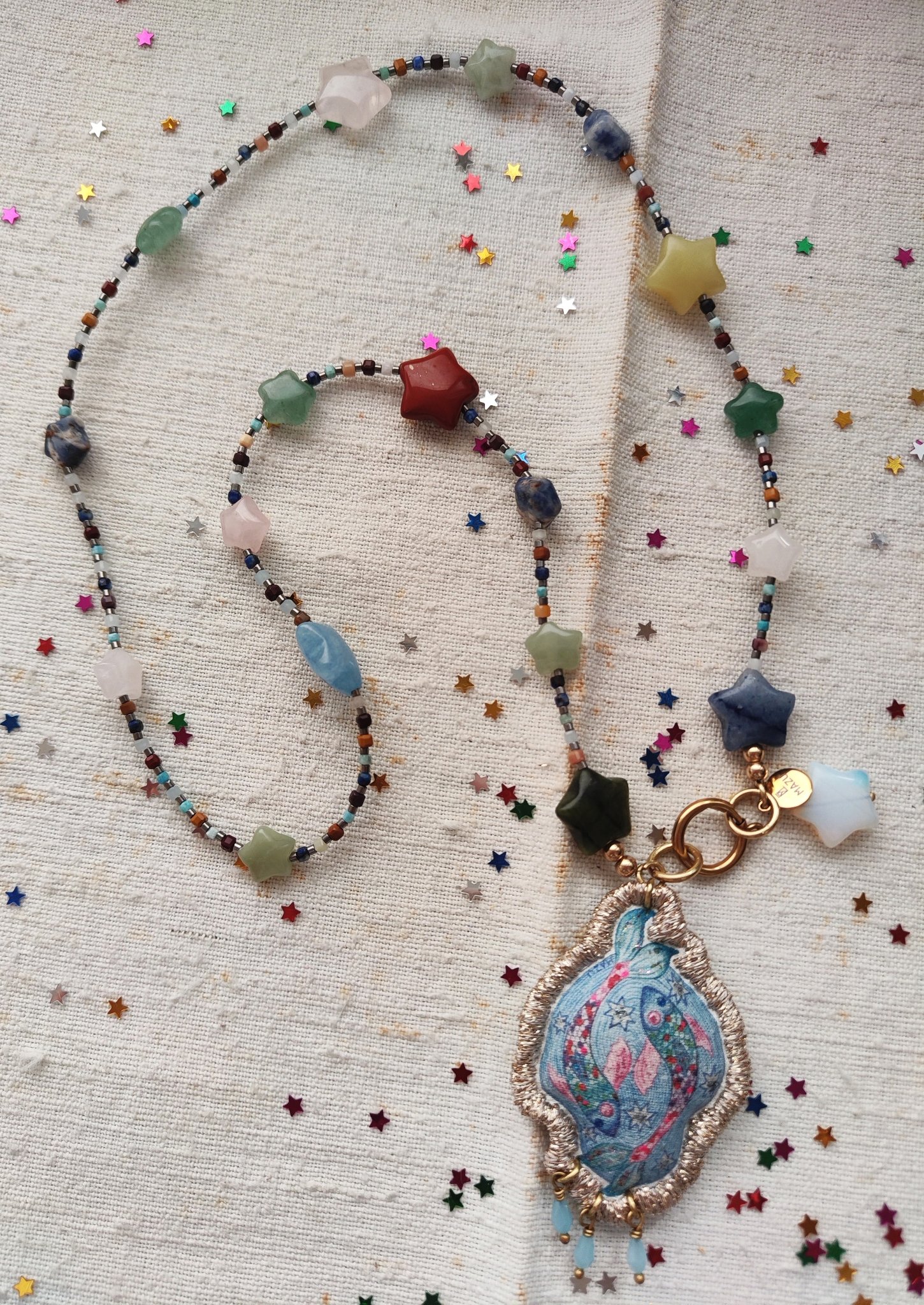 Come tutti noi, anche la collana ZODIACO è fatta di stelle 🌌. Sono sette le stelle grandi ⭐ in pietra che la compongono (giada verde, red stone, giada blu, quarzo rosa, giada limone, avventurina blu e opale), quattro le stelle piccole ✨ (giada Xiuyan, sodalite, avventurina e quarzo rosa), cinque le pietre 🪨 che ho selezionato per le perline che collegano le stelle (acquamarina, turchese peruviano, mookaite, lapis lazuli e morganite) e poi ci sono le perline minuscole in vetro color piombo.