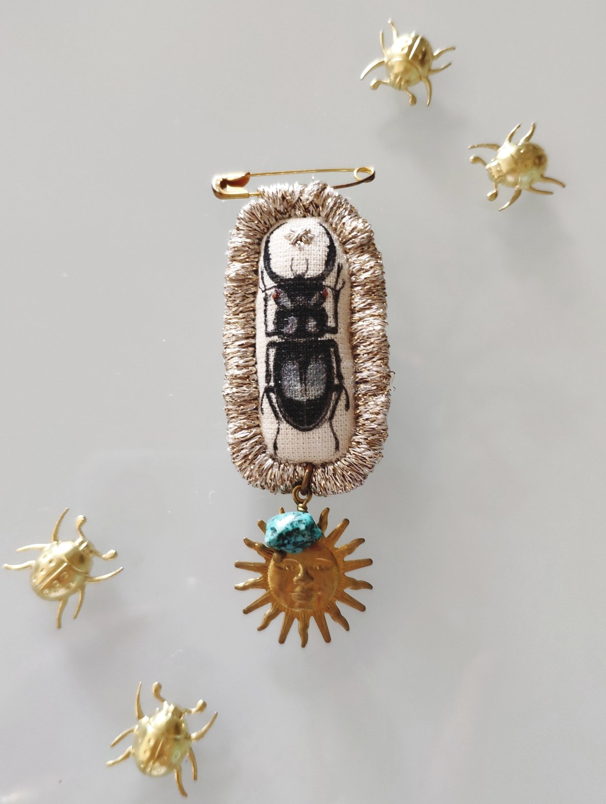 La spilla 'Cervo Volante' fa parte della collezione Insectarium. Il pendente è un mio disegno, una stampa ad altissima qualità su tela da pittura ritoccata con i colori per la stoffa e ricamata e rifinita con il filo dorato DMC. Al pendente ho aggiunto un sole in ottone e una piccola pietra in pasta turchese.