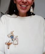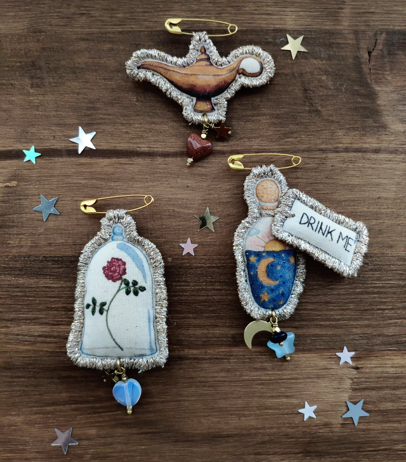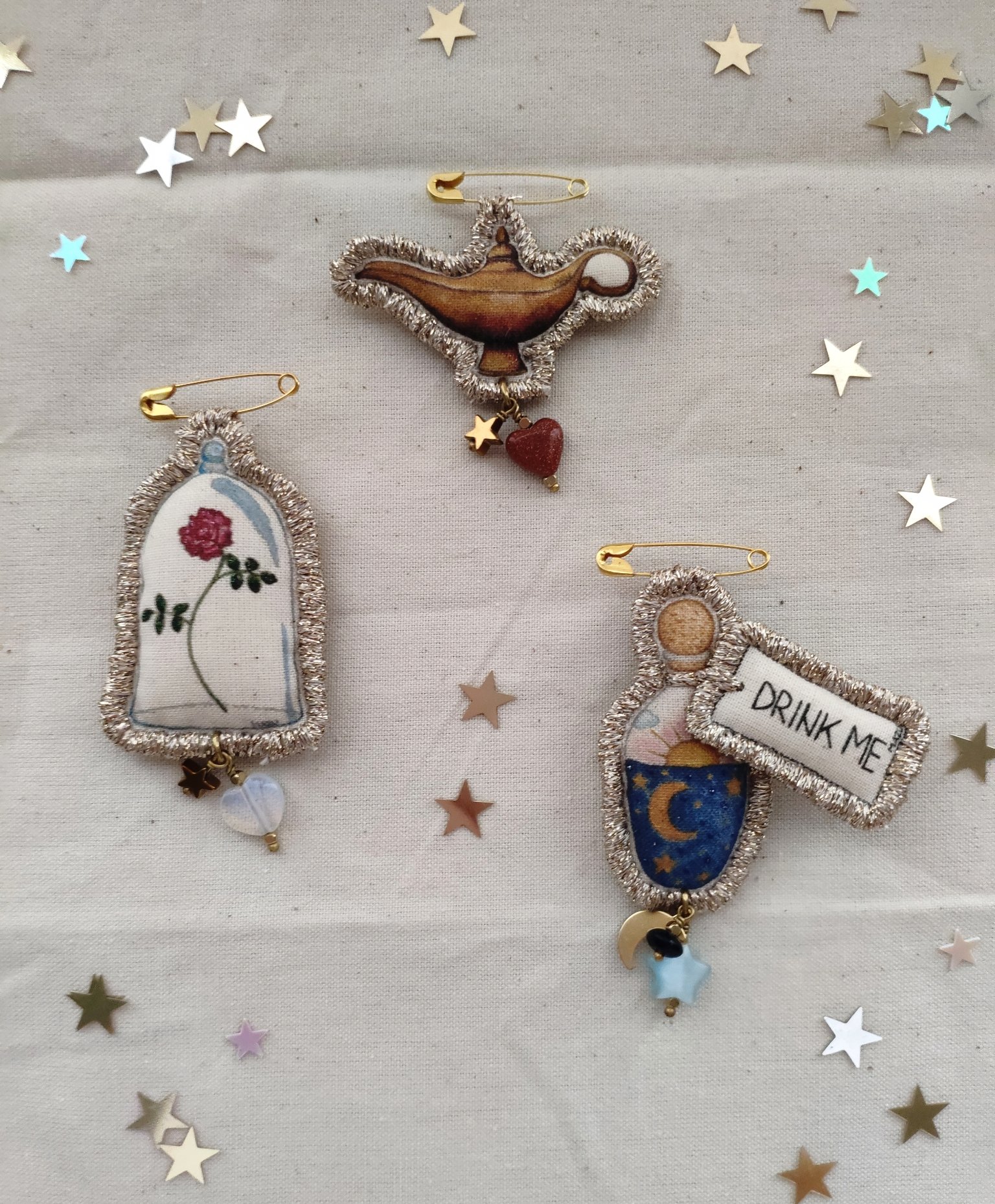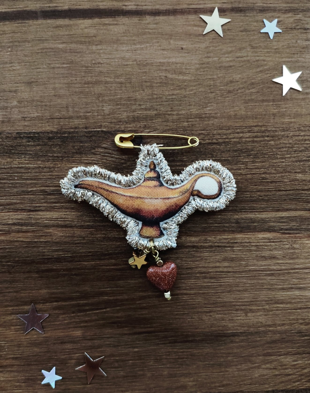 La spilla 'Esprimi un desiderio!' fa parte della collezione Fiabe. Il pendente è un mio disegno della Lampada magica, una stampa ad altissima qualità su tela da pittura ritoccata con i colori per la stoffa e ricamata e rifinita con il filo dorato DMC. Al pendente ho aggiunto una stellina in ematite e il cuore in goldstone. Goldstone è originariamente creato quando gli alchimisti stavano lavorando per creare oro. La sua scintilla è dovuta a macchie di rame che gli donano il color arancio scuro.
