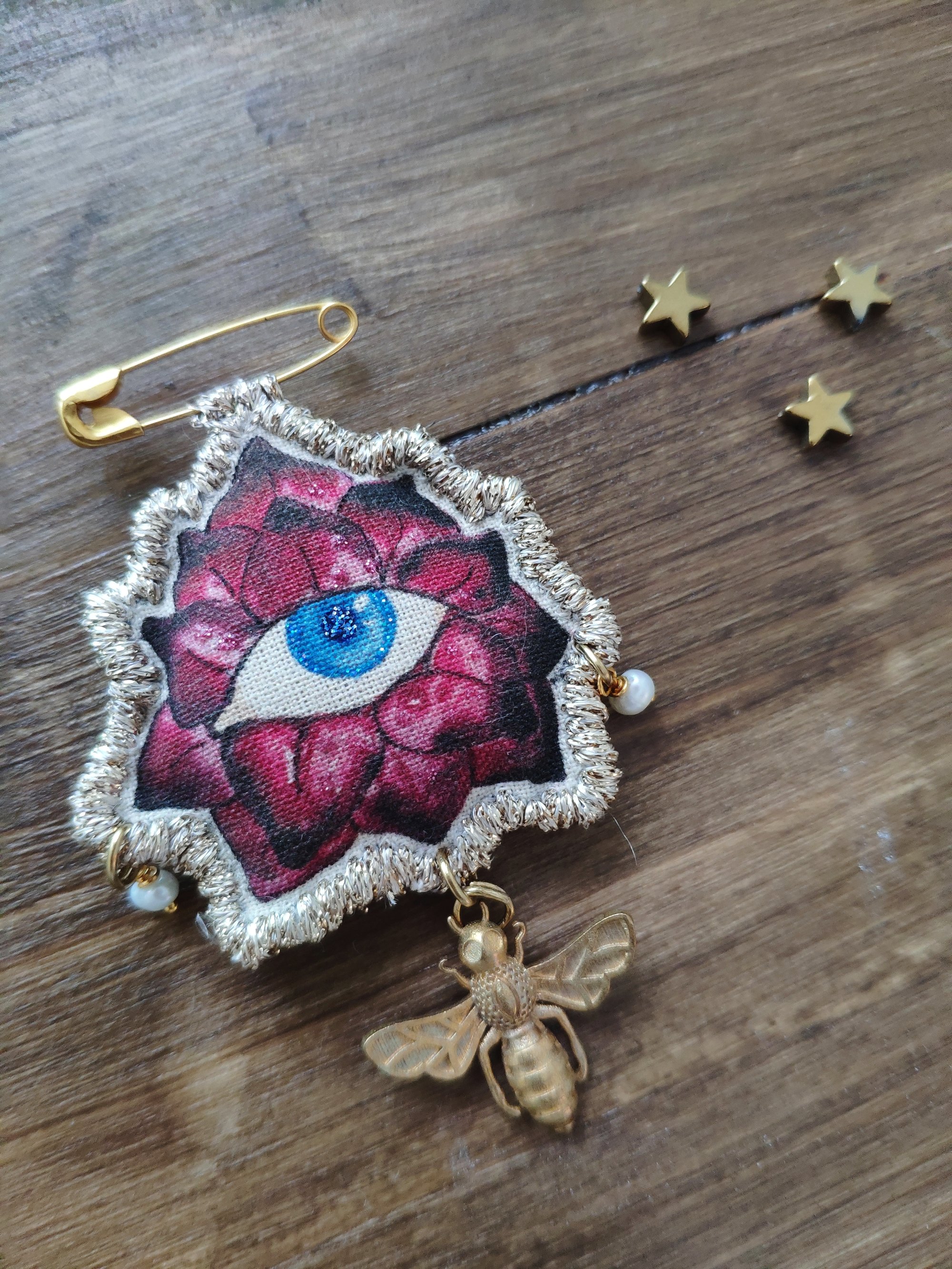 La spilla 'Fiore nascosto' fa parte della collezione 'Secretum'. E' un mio disegno trasferito su tela da pittura, ritoccato e rifinito con il filo dorato, cucito alla spilla da balia color oro.