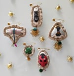 La spilla Impossibile fa parte della collezione Insectarium. Il pendente è un mio disegno, una stampa ad altissima qualità su tela da pittura ritoccata con i colori per la stoffa e ricamata e rifinita con il filo dorato DMC. Al pendente ho aggiunto un sole in ottone e un piccolo quadrifoglio in giada.