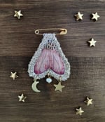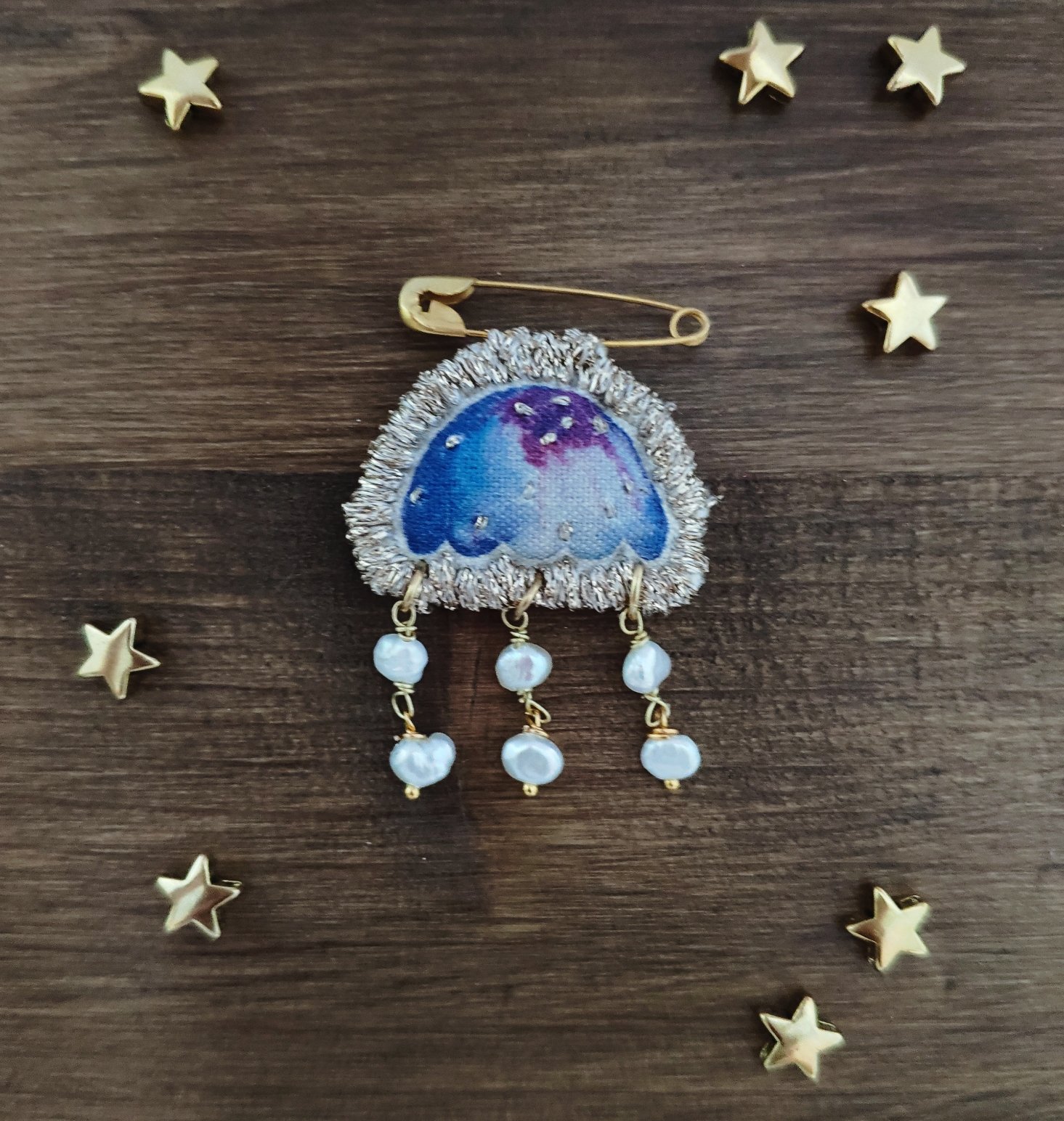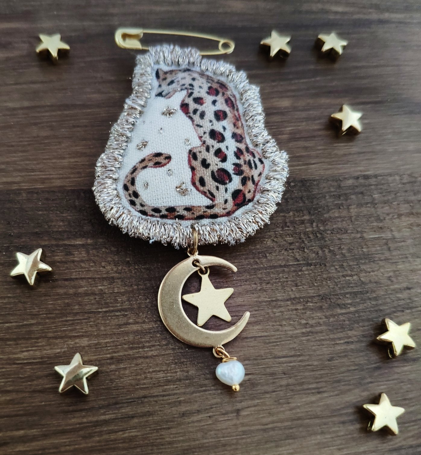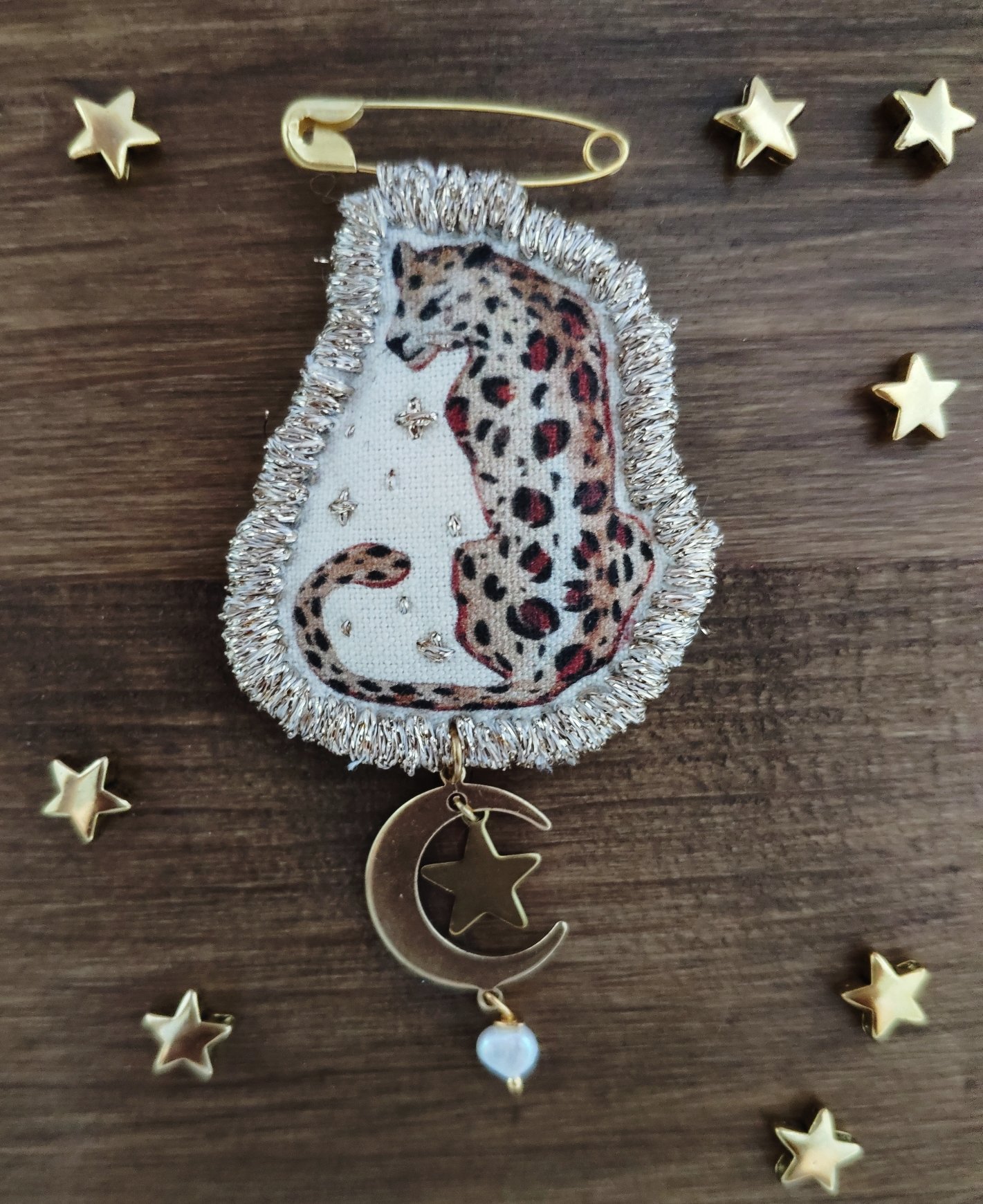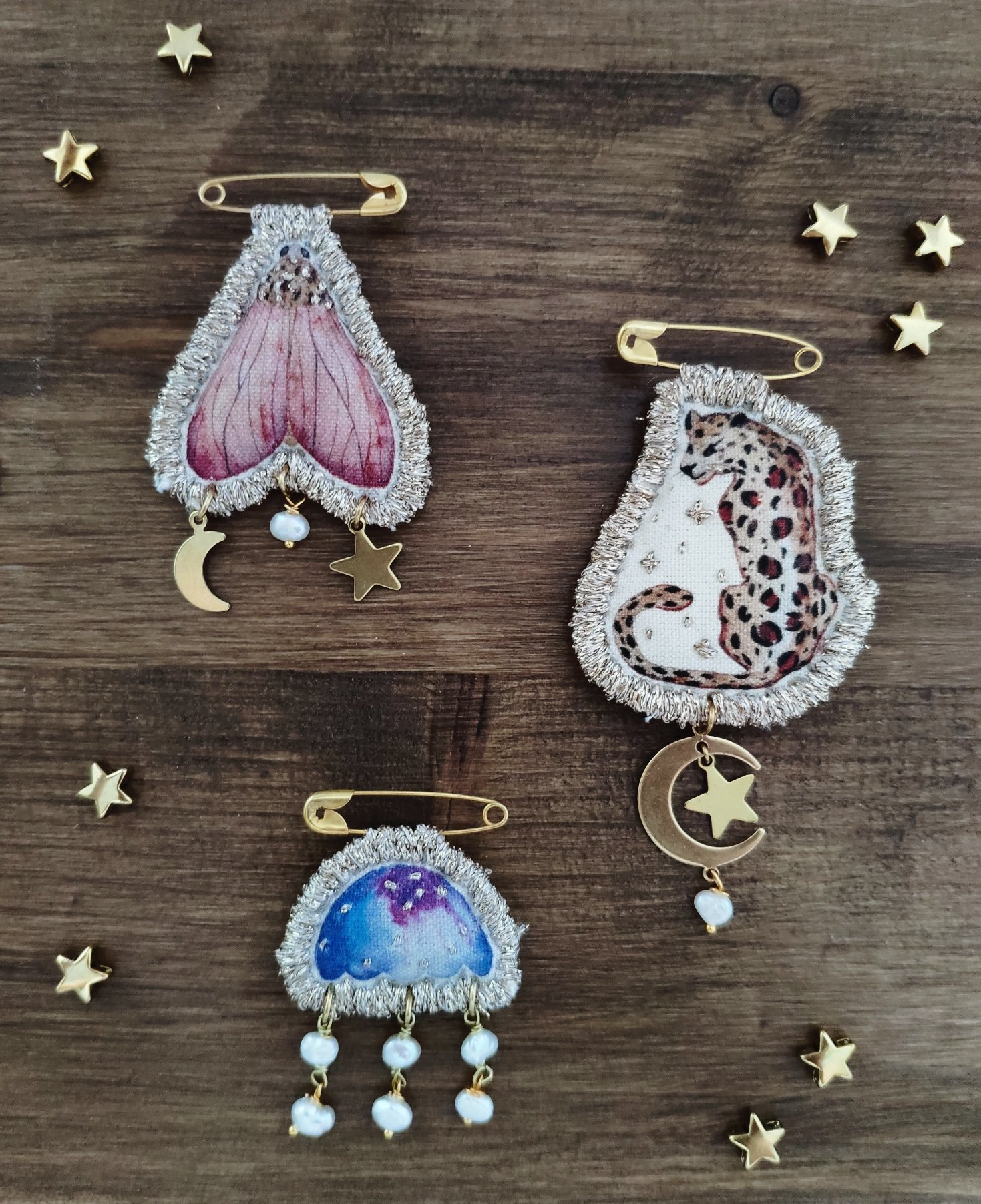 Le spille 'Nocturnia' fanno parte dell'omonima collezione. Sono i miei disegni ad acquarello trasferiti su tela da pittura, ritoccati e rifiniti con il filo dorato cuciti alla spilla da balia color oro.