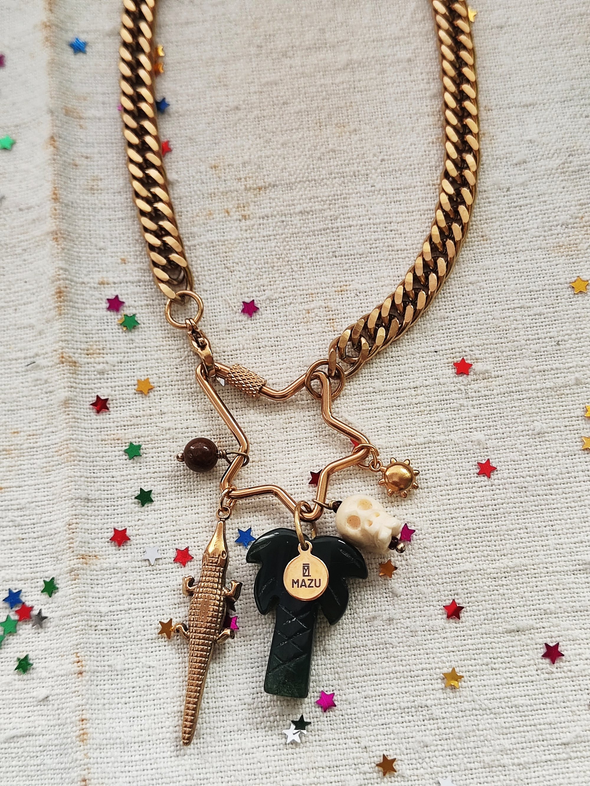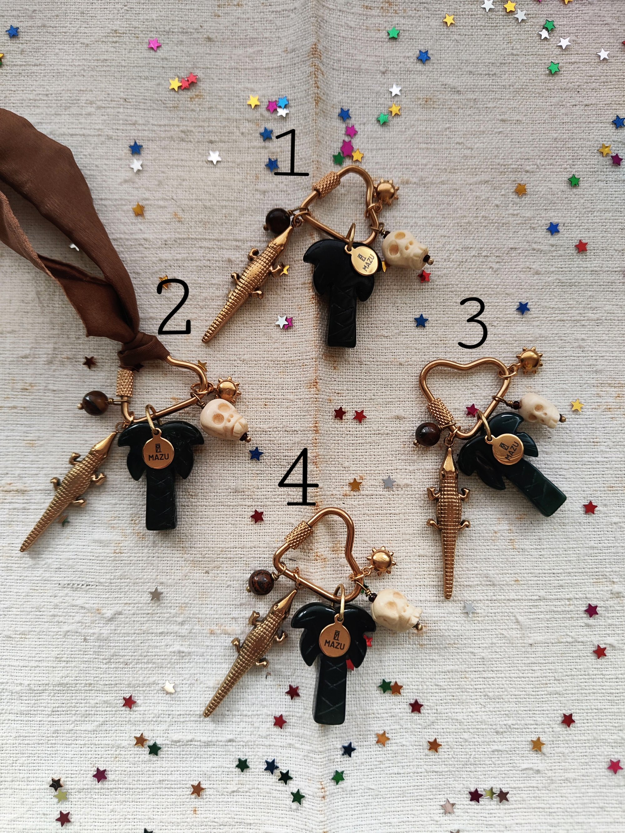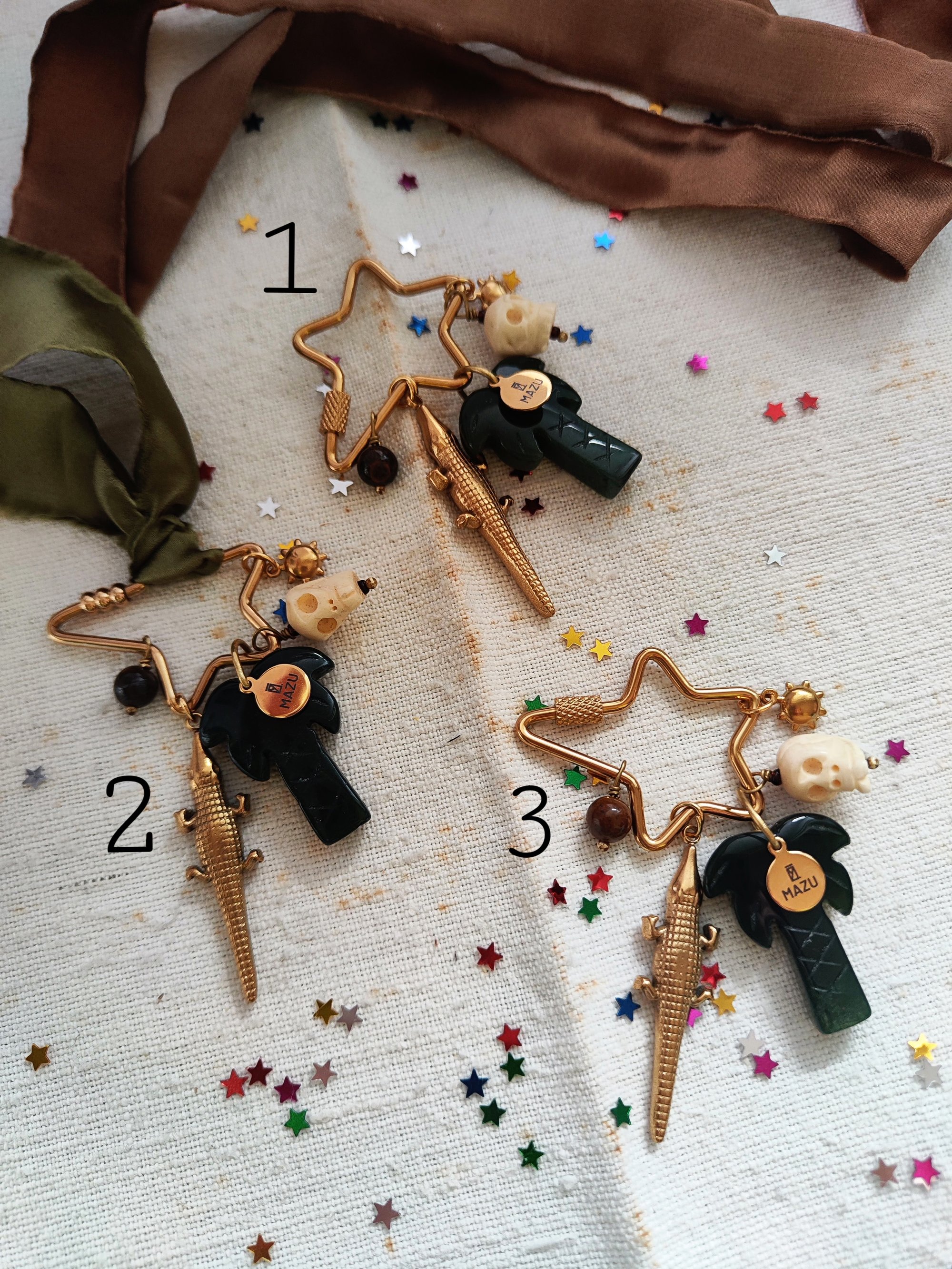 Abbiamo tre forme della chiusura in acciaio dorato: la stella (3,5x7 cm), il cuore (2,2x6 cm) e l'ovale (2,5x5,5 cm). Ogni una ha cinque pendenti: Perlina in pietra Occhio di tigre π― (aka noce di cocco π₯₯), il coccodrillo π in acciaio dorato, la palma π΄ in agata indiana con la targhetta MAZU, il teschio color avorio π e un piccolo sole in acciaio dorato βοΈ. Con ogni chiusura riceverete un nastro in seta verde oliva o marrone, potete scrivermi la vostra preferenza nelle note. πβπ»
