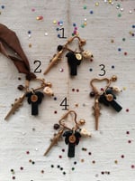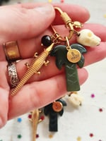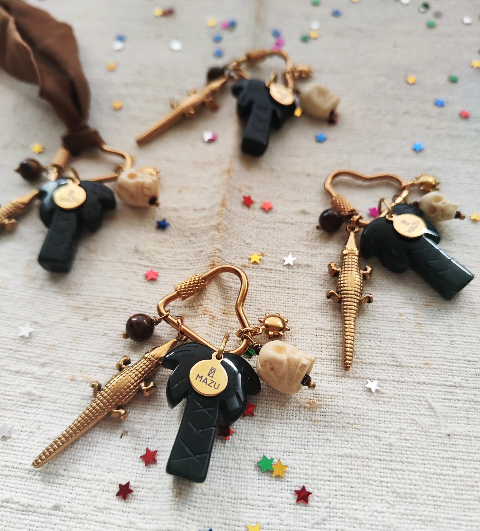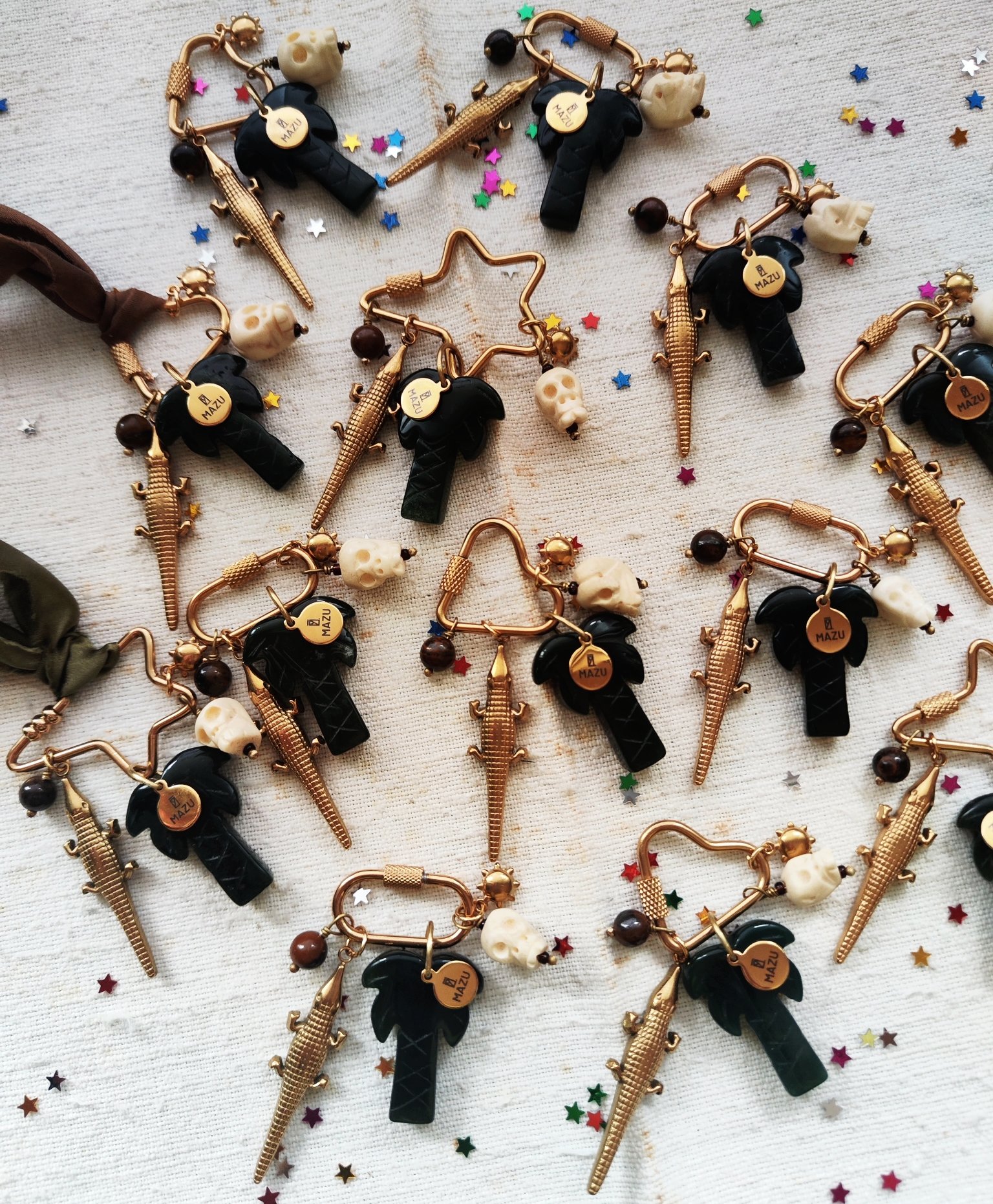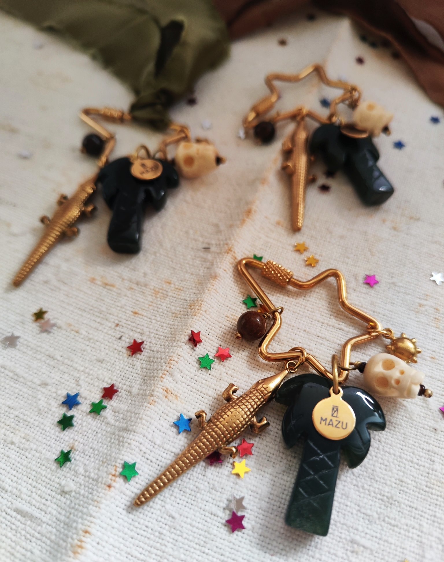 Abbiamo tre forme della chiusura in acciaio dorato: la stella (3,5x7 cm), il cuore (2,2x6 cm) e l'ovale (2,5x5,5 cm). Ogni una ha cinque pendenti: Perlina in pietra Occhio di tigre π― (aka noce di cocco π₯₯), il coccodrillo π in acciaio dorato, la palma π΄ in agata indiana con la targhetta MAZU, il teschio color avorio π e un piccolo sole in acciaio dorato βοΈ. Con ogni chiusura riceverete un nastro in seta verde oliva o marrone, potete scrivermi la vostra preferenza nelle note. πβπ»