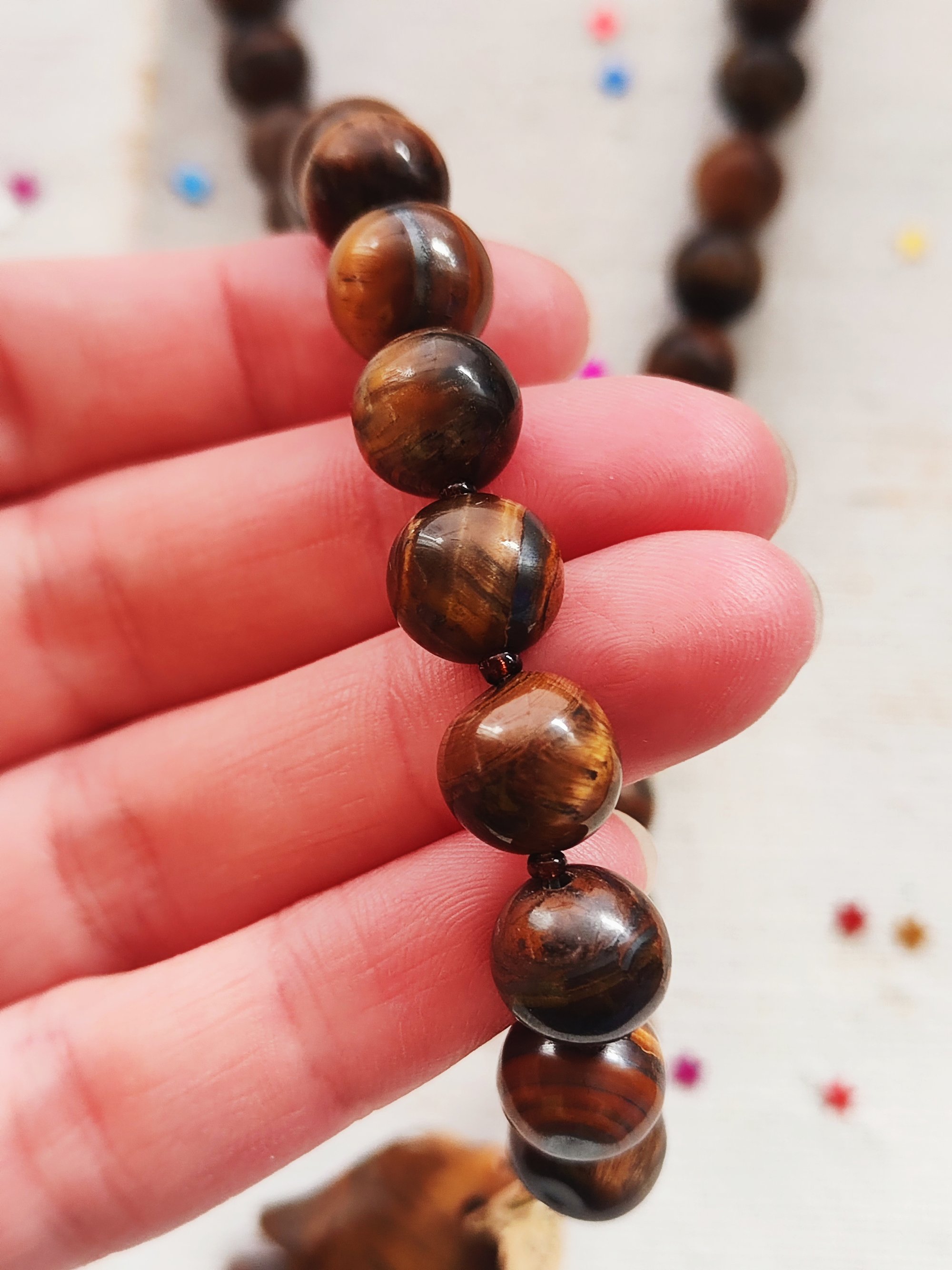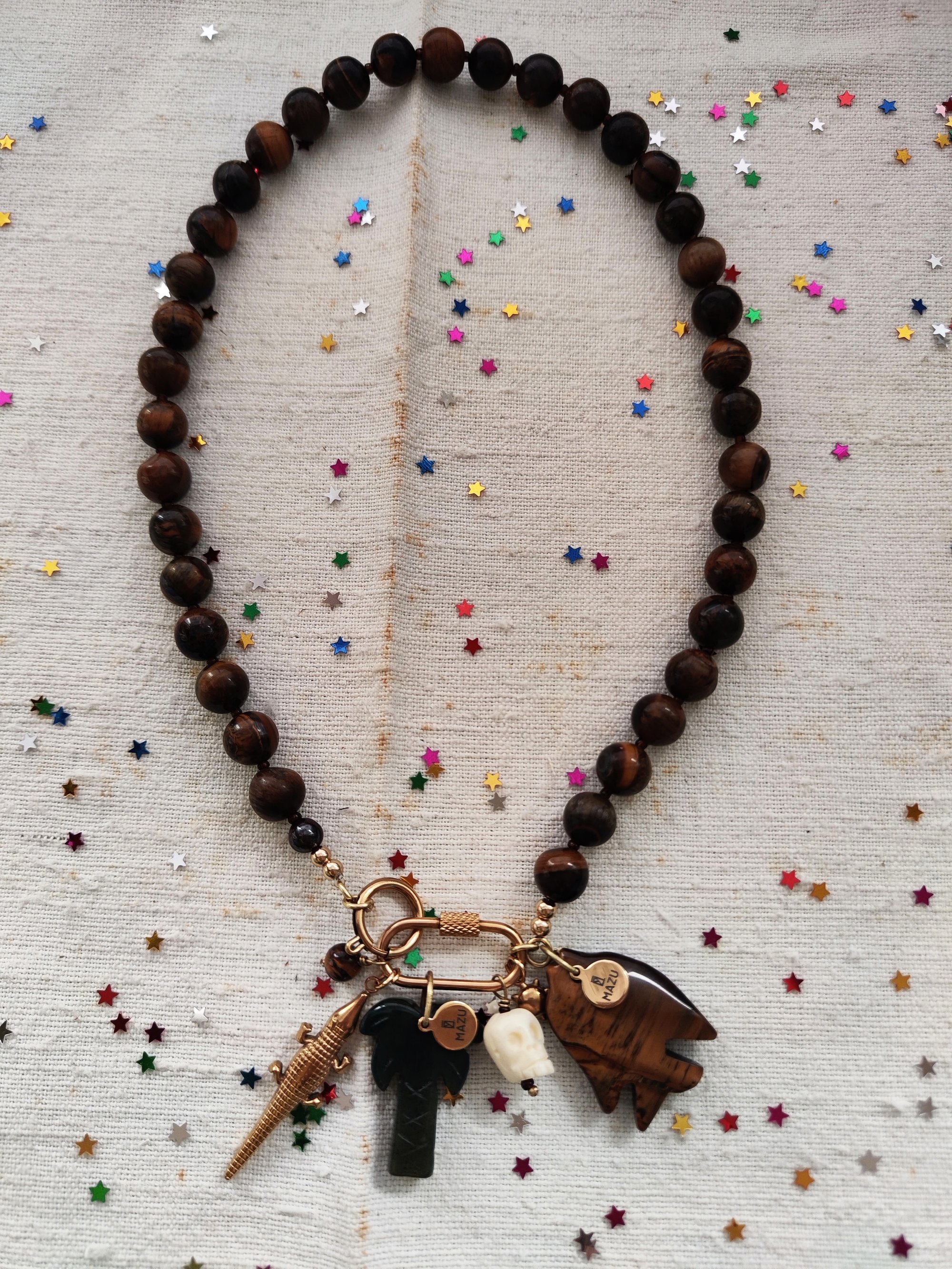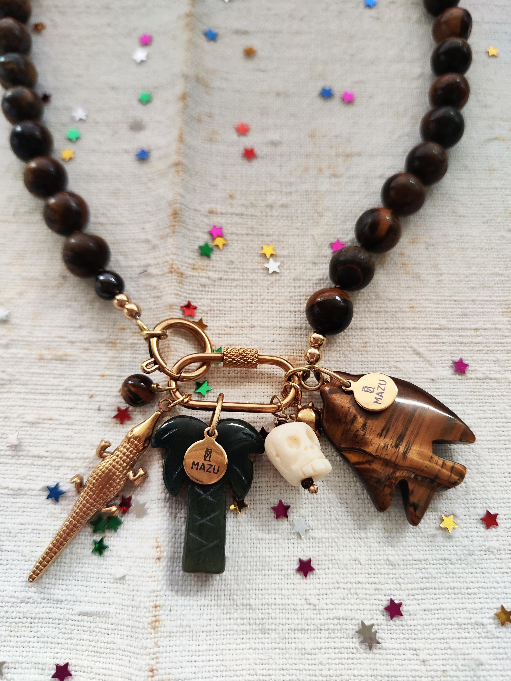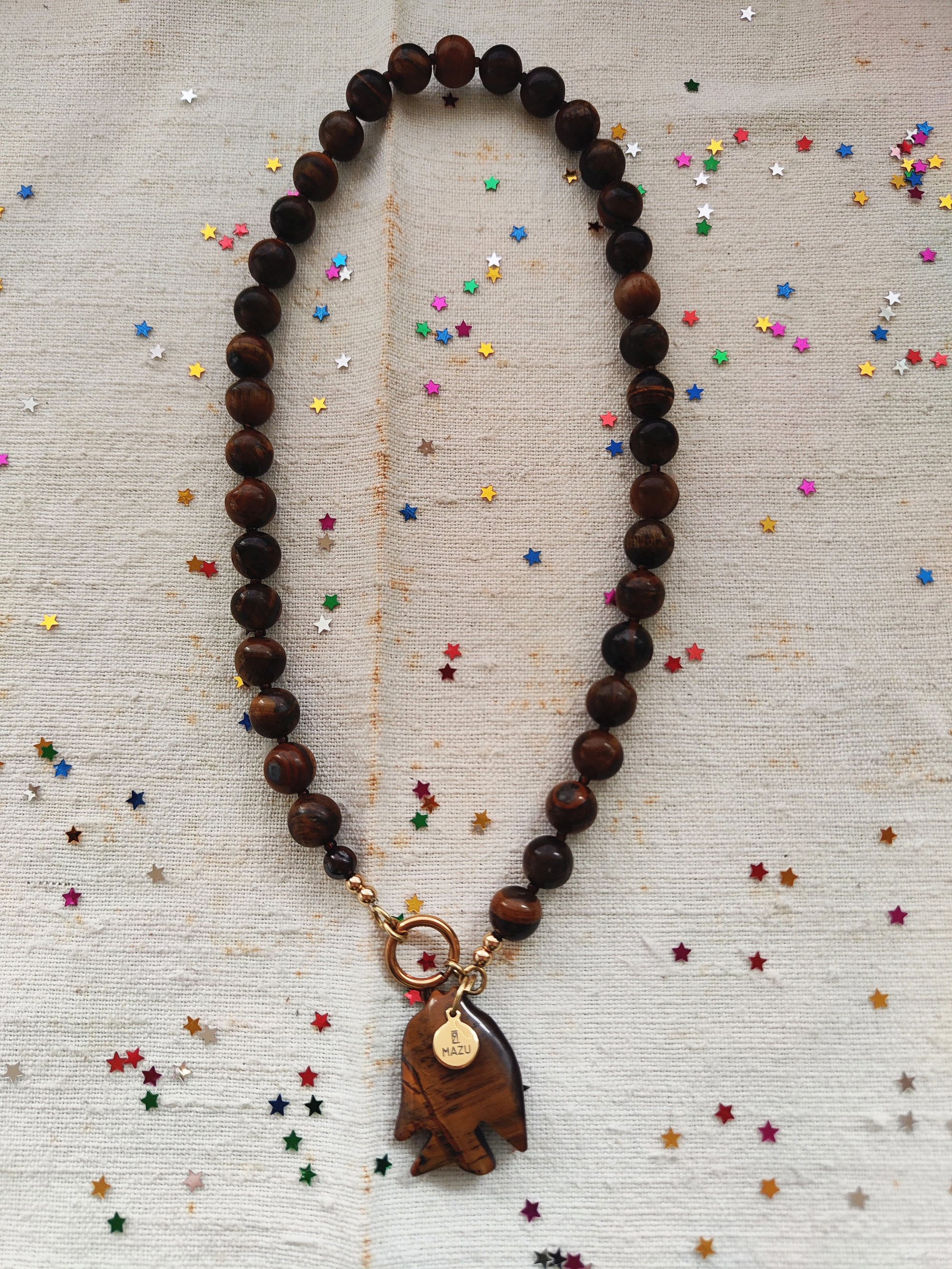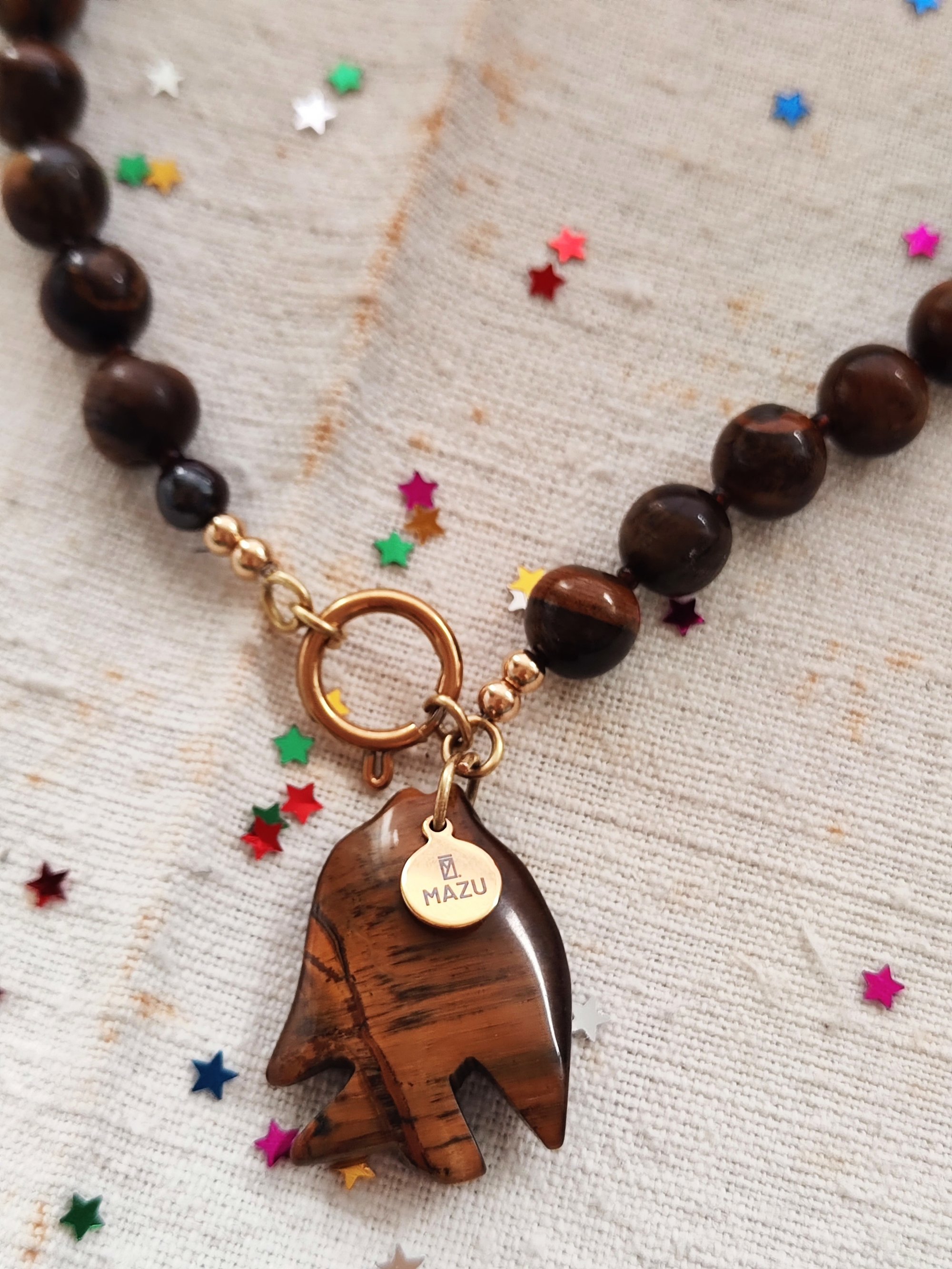 E poi c'Γ¨ la collana (lunga 46 cm) che, oltre le perline in occhio di tigre alternate alle perline piccole in vetro marrone, vicino alla chiusura ha un pesce π π€ fatto della stessa pietra e una targhetta MAZU β¨. La sua chiusura Γ¨ rimuovibile e potete inserire una chiusura MAZU della stessa capsule.