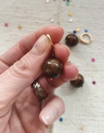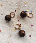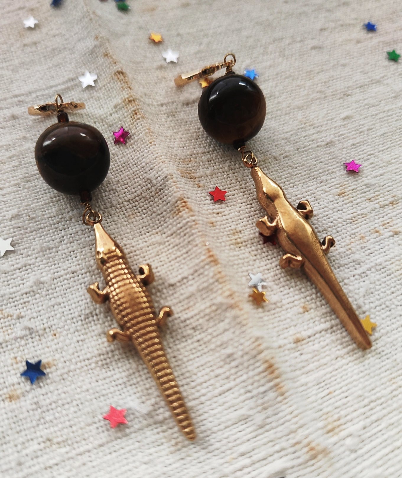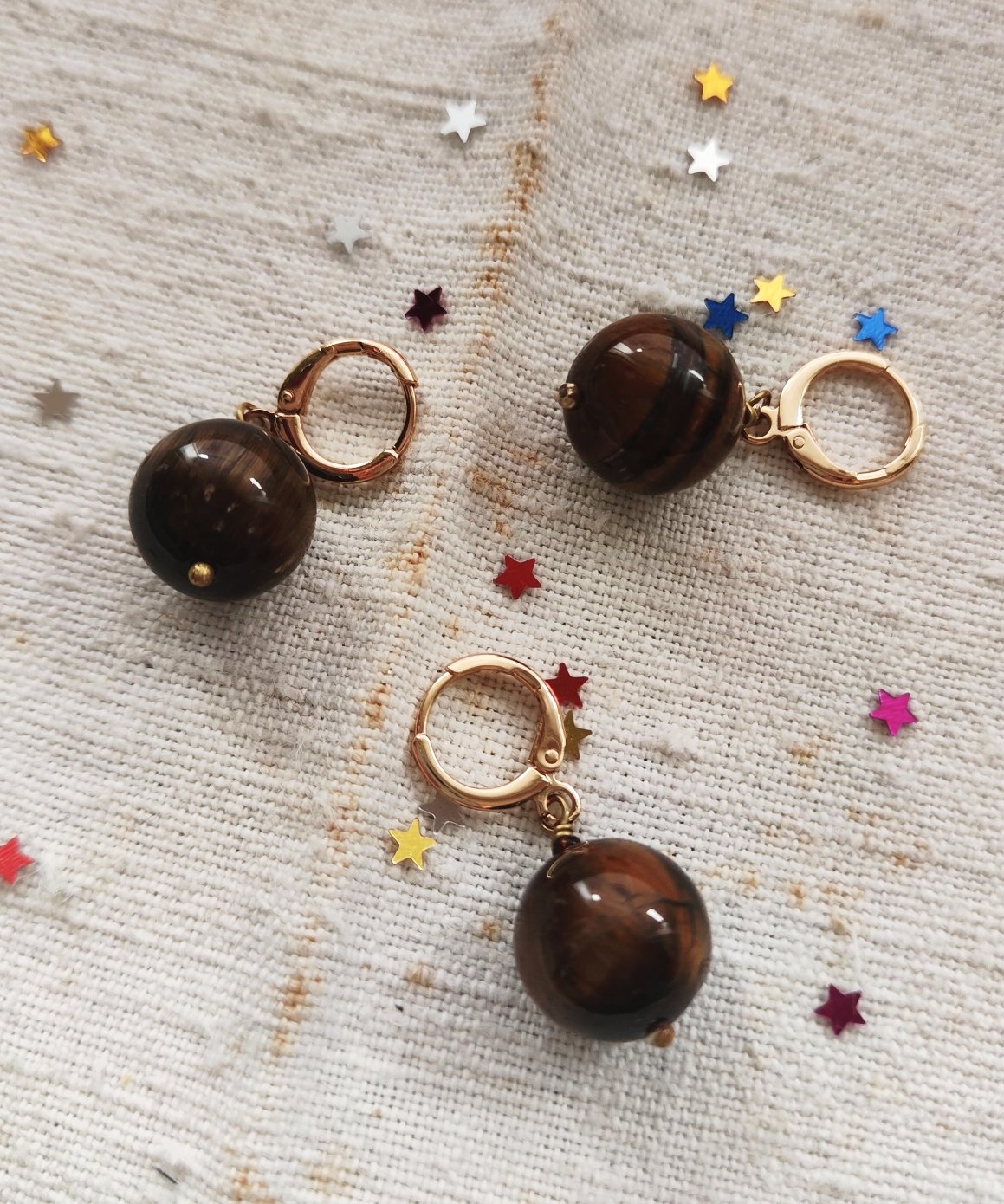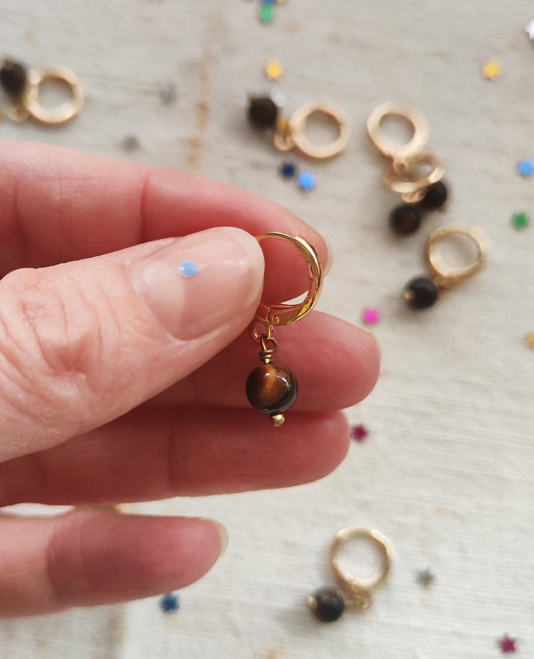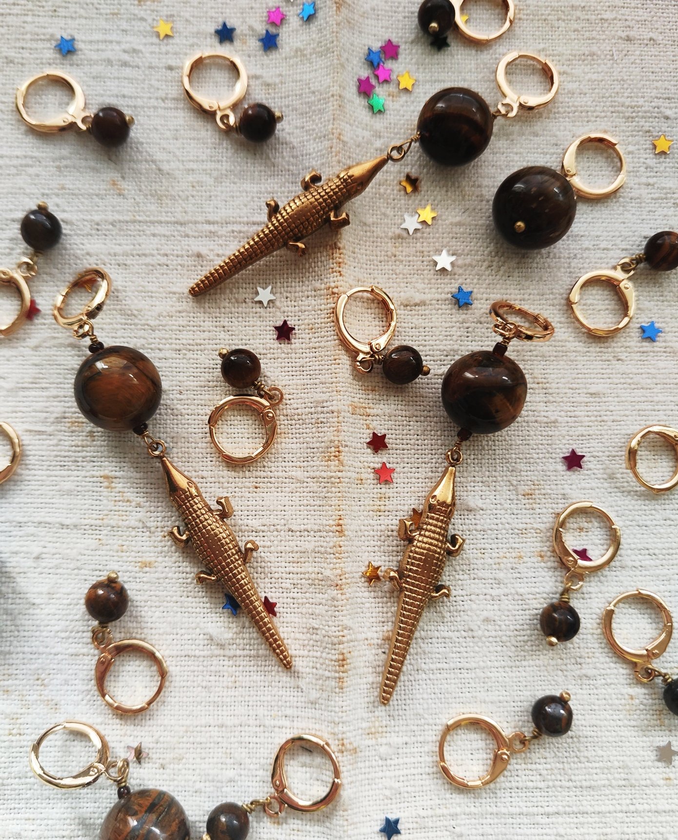 Oltre le chiusure trovate tre tipi di mono orecchino: con la perlina in occhio di tigre grande (1,2x3,3 cm), con la perlina in occhio di tigre piccola π₯₯ (1x2,5 cm) e con la perlina in occhio di tigre grande con il coccodrillo π sotto (1,2x8 cm, sempre venduti singolarmente, nella foto vedete fronte e retro). I gancetti degli orecchini sono placcati oro.